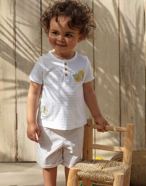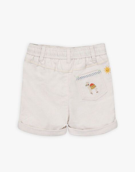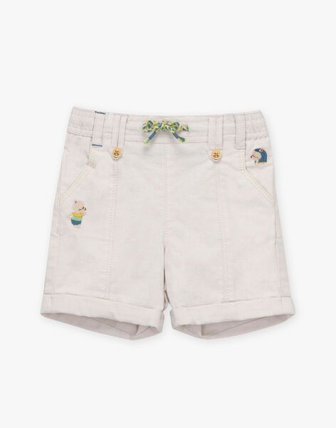 Бежови бермуди с еластична талия и връзки, диагонални джобове отпред ,един джоб отзад с контрастни шевове и анимация и обърнати зашити подгъви на крачолите.