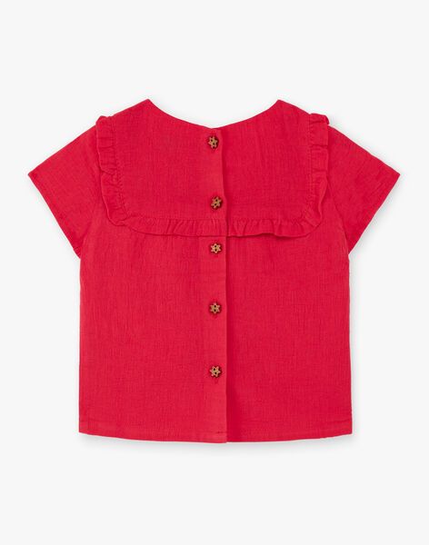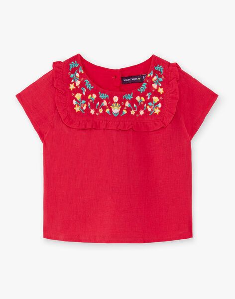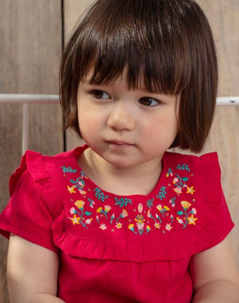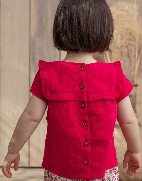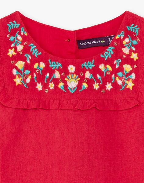 Риза с флорална бродерия на деколтето, цвят малина, къси ръкави, кръгло деколте.Воали отпред на блузата Отваряне с дървени копчета във формата на цветя отзад