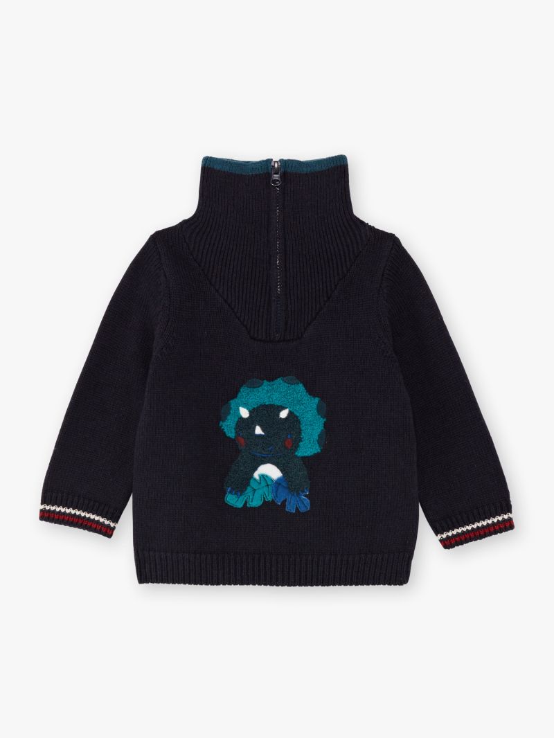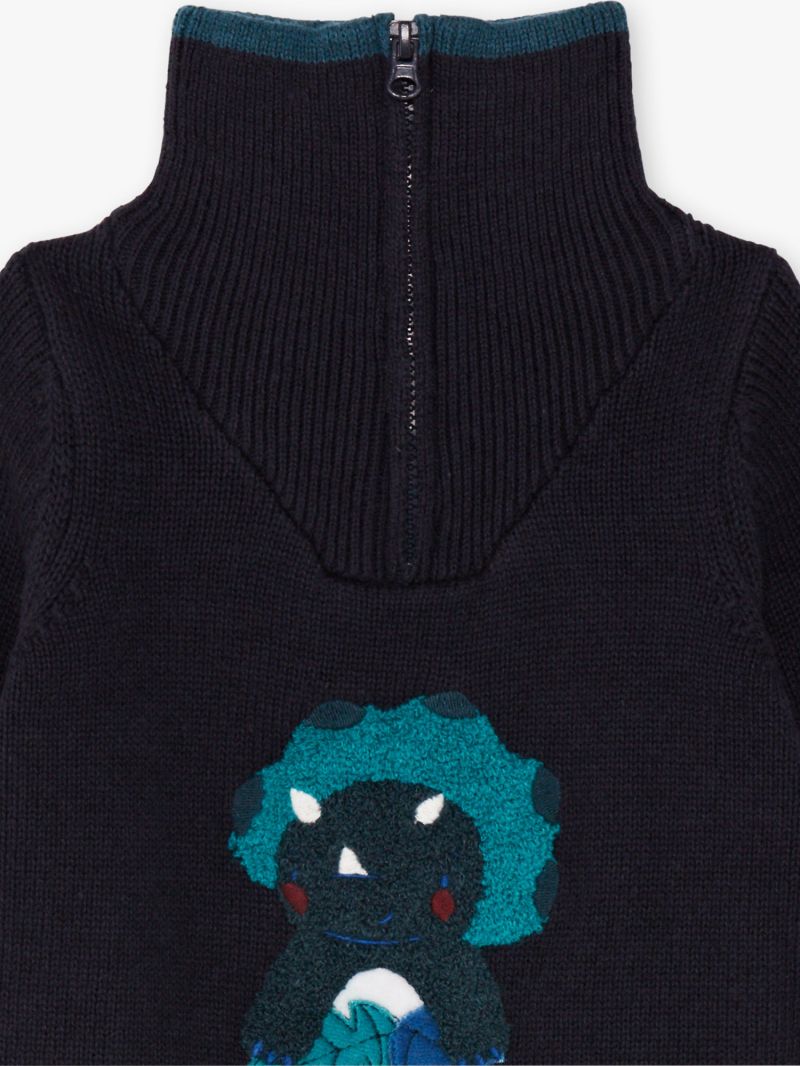 Тъмносин пуловер с висока яка за бебе момче. Красива бродерия на динозавър в различни нюанси на синьо. Рипсена яка, маншети и кант. Цветни ивици по маншетите в бял и червен цвят. Изключително мека памучна материя в съчетание с вълна.