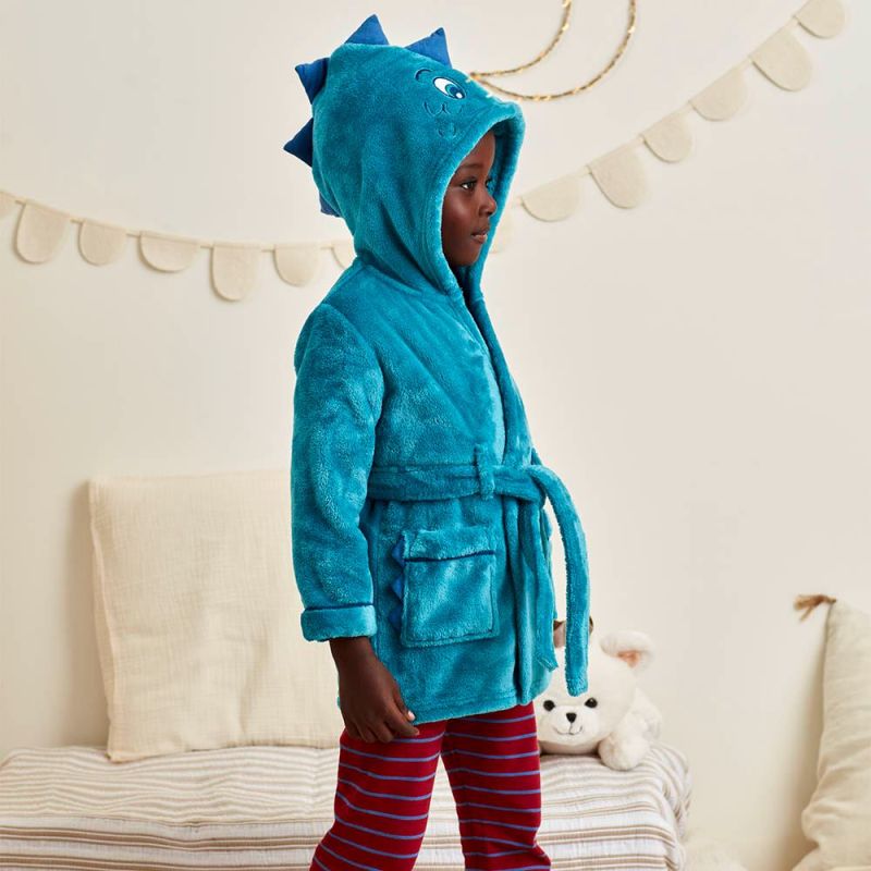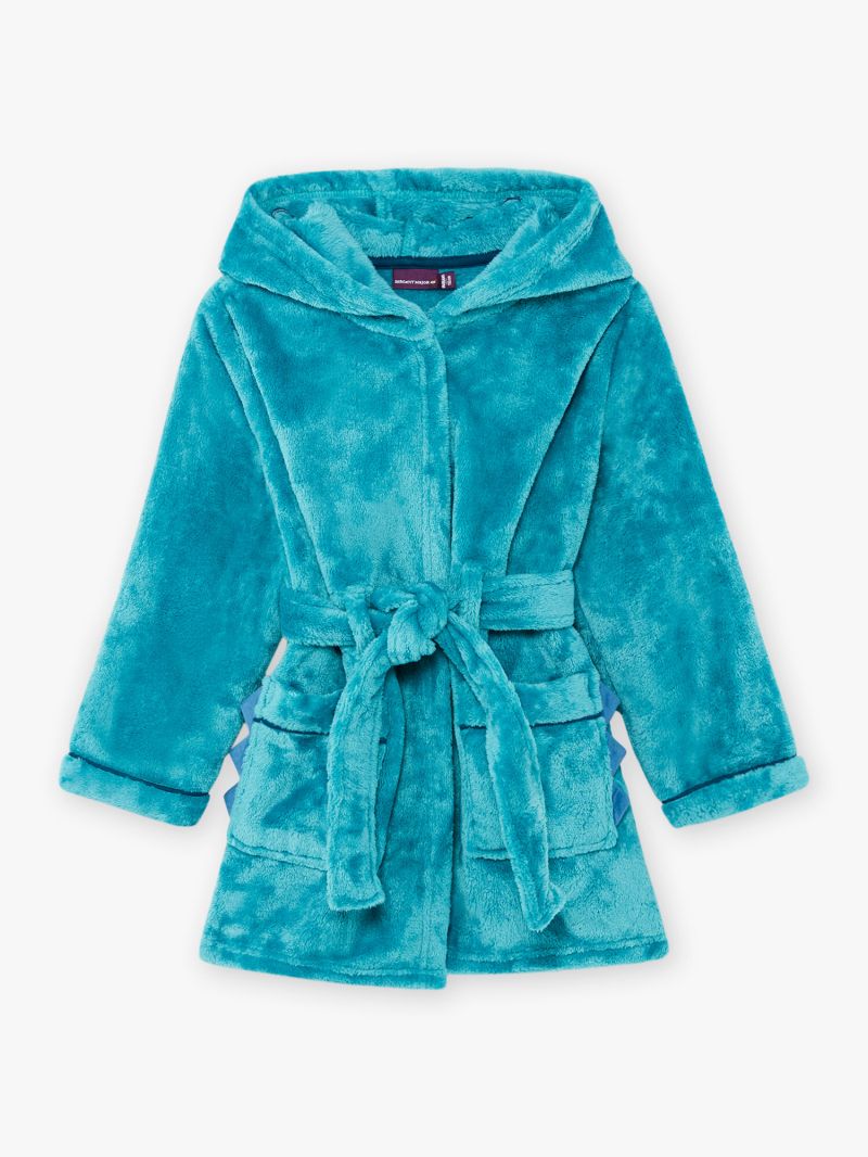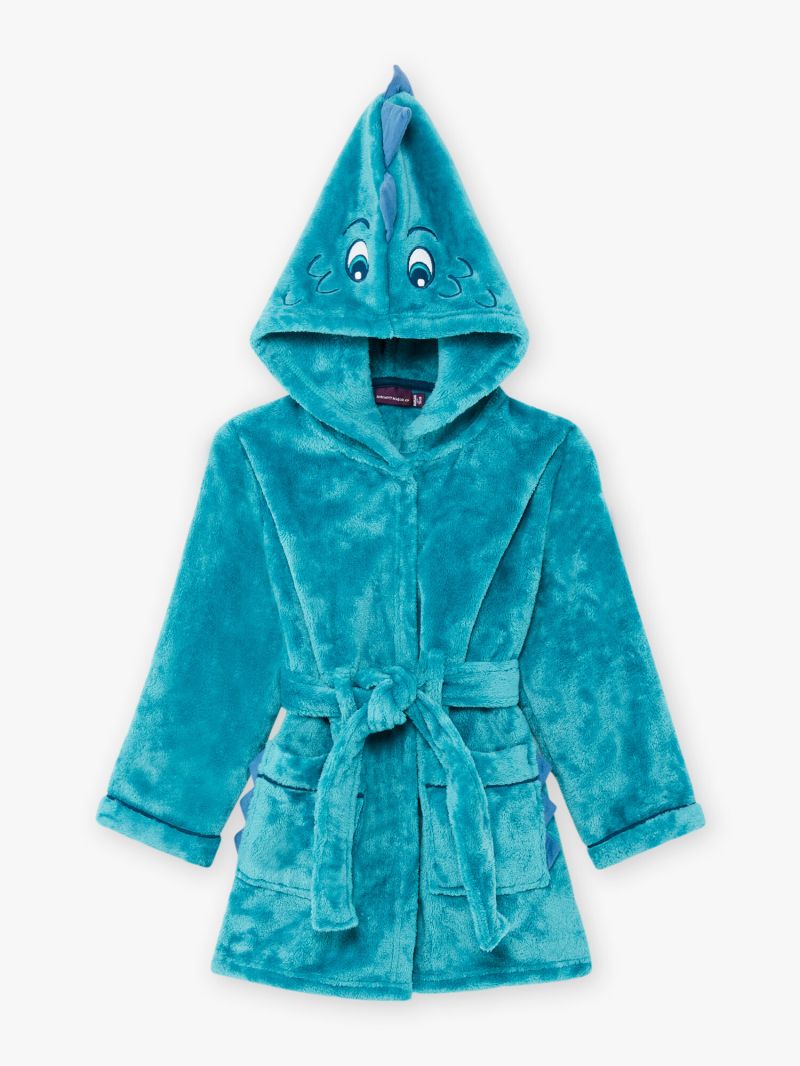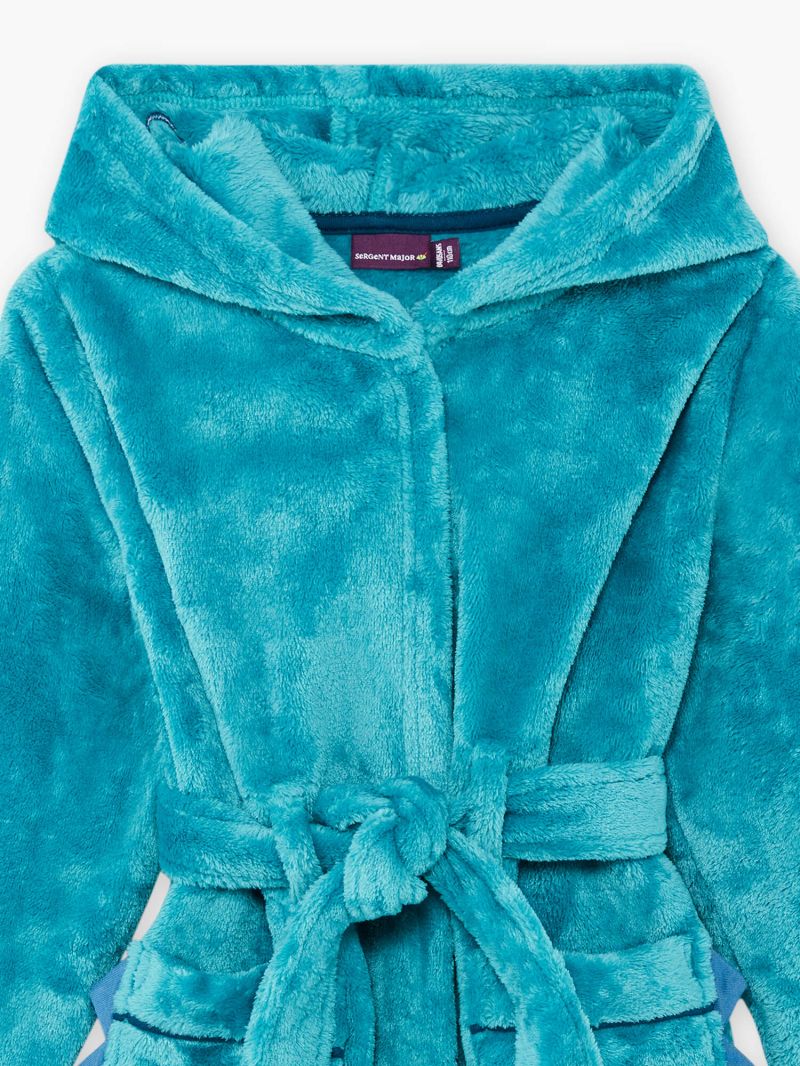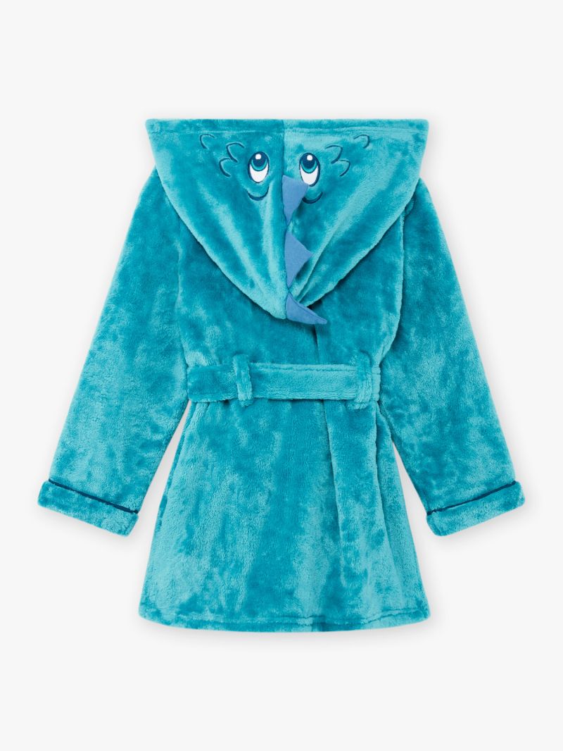 Домашен пухкав халат с качулка и мотиви на дракон в тюркоазен цвят, два предни джоба, колан със завързване на талията, топла и пухкава материя.