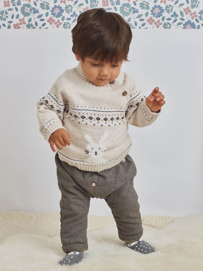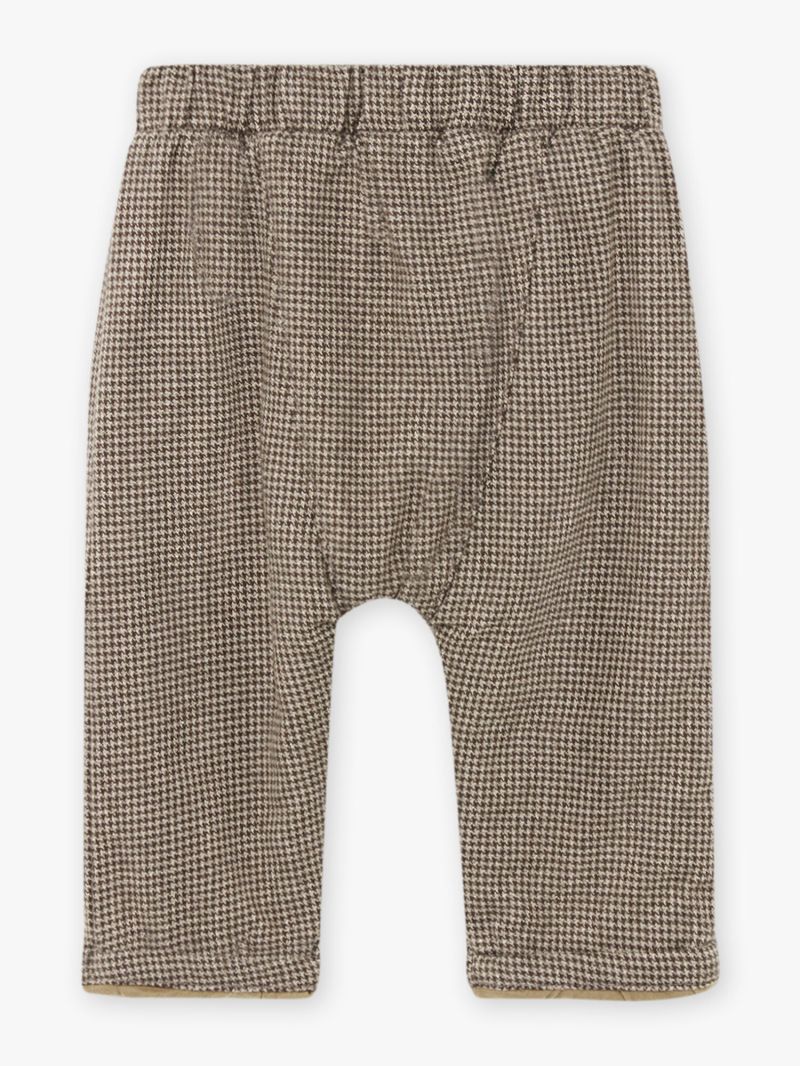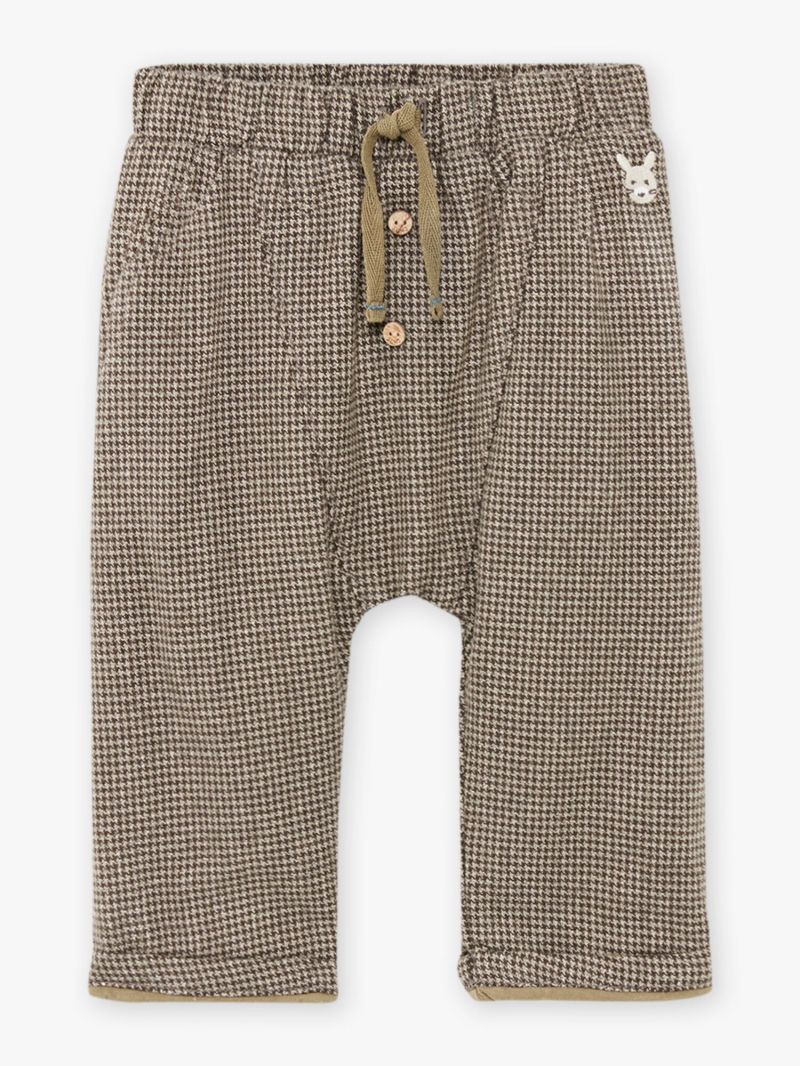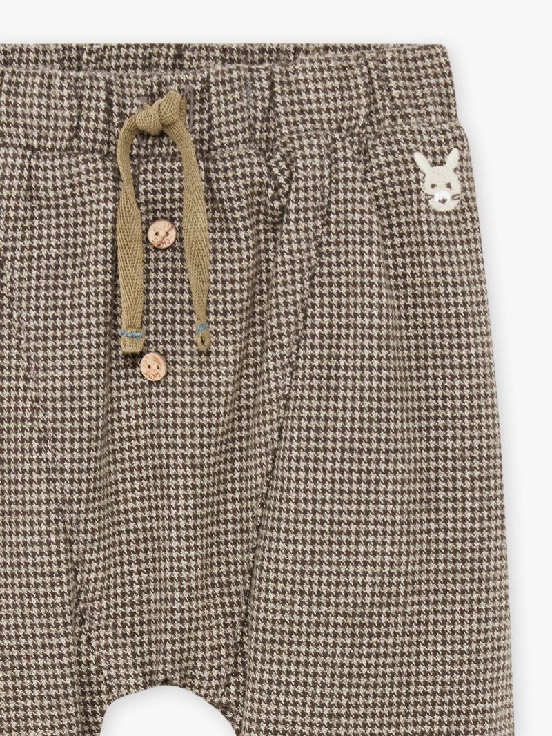 Свободни подплатени панталони пепит от мека памучна смес в кафяв цвят, ластик и връзки в талията, декоративни копчета в предната част, сладка бродерия на зайче , топла и мека материя.