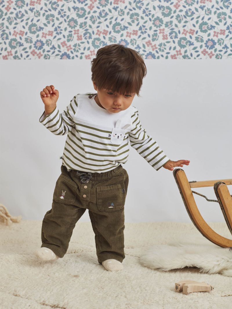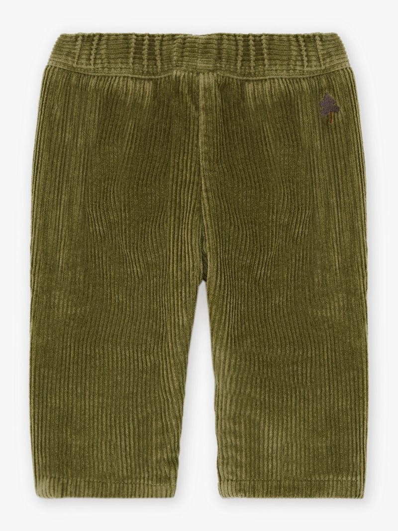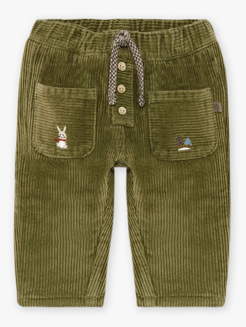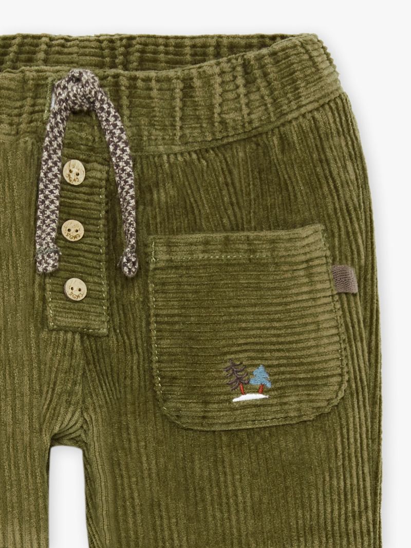 Подплатени памучни панталони с меко рипсено кадифе в цвят каки, ластик на талията с връзки, декоративни копчета под тях, два предни джоба с бродерия на животинки, топла памучна подплата.
