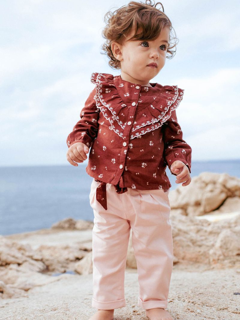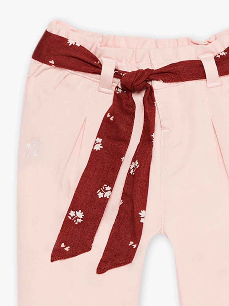 Панталони от мека памучна смес в светлорозов цвят с покрит ластик , малък волан на талията с подвижно коланче в цвят бордо с флорален принт. Два предни и два задни джоба, леко плисе в предната част, мека и комфортна материя.