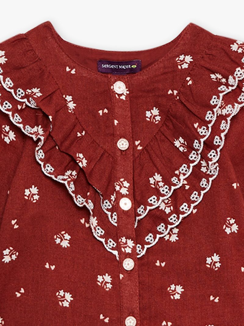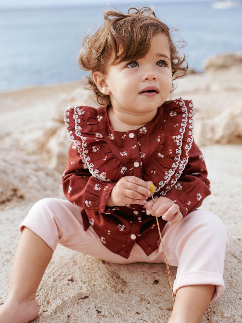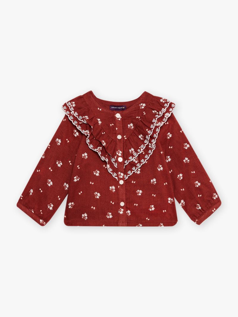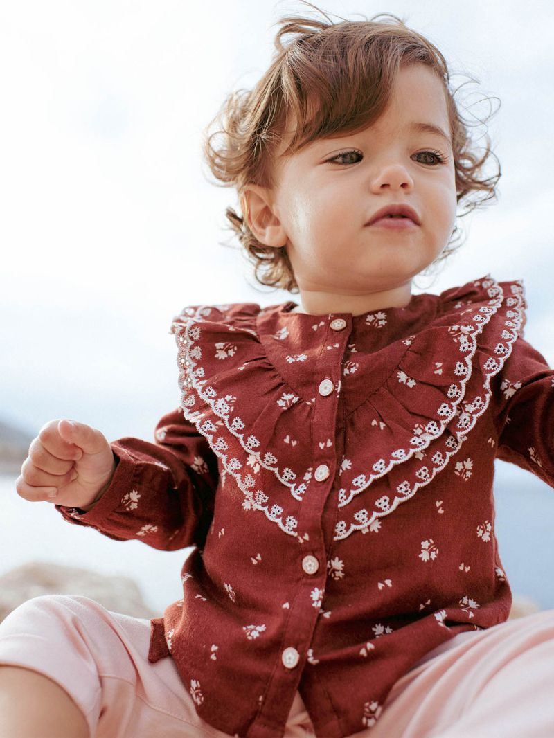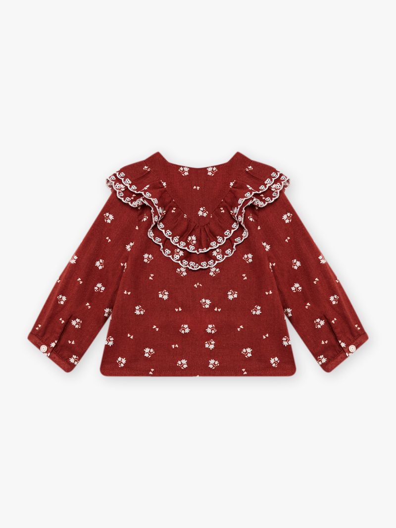 Риза с дълги ръкави от тъкан памук в основен цвят бордо. Принт в цвят екрю, с красиви волани с кант от елегантна бродерия в предната част имитиращи яка, закопчаване с копчета по цялата дължина отпред. Мека и комфортна памучна материя.