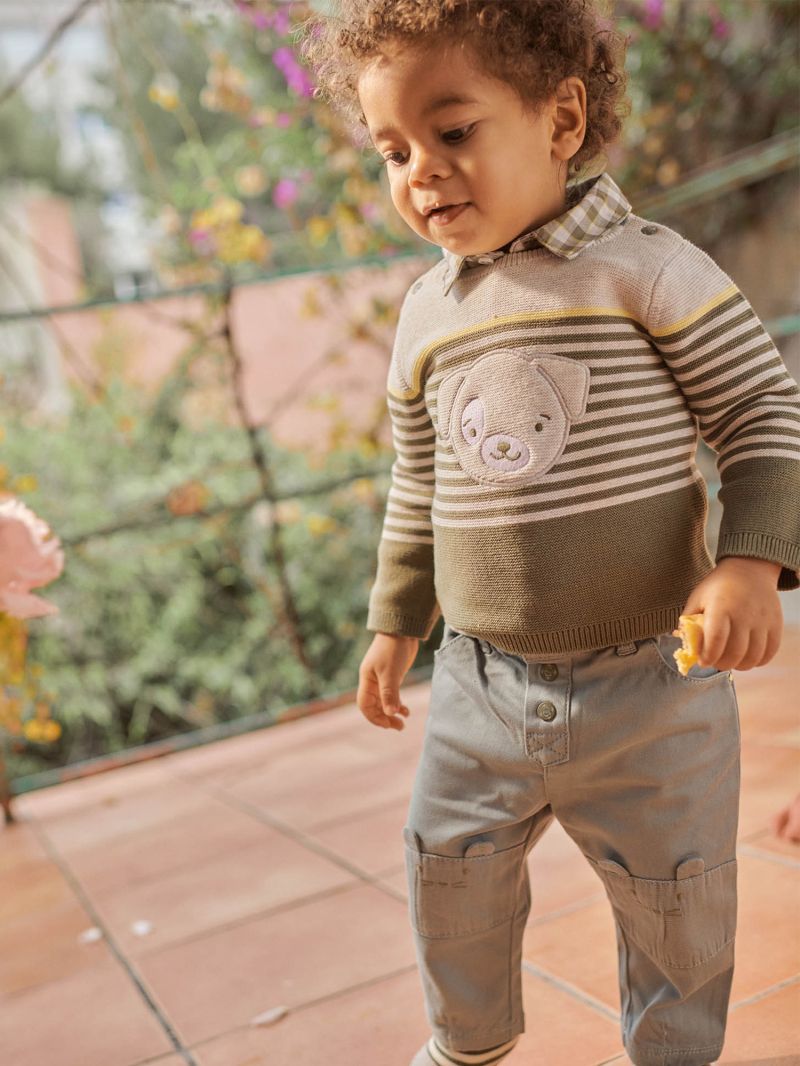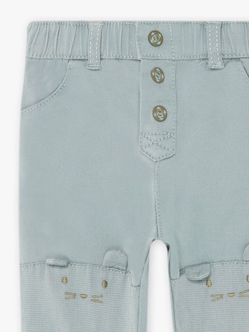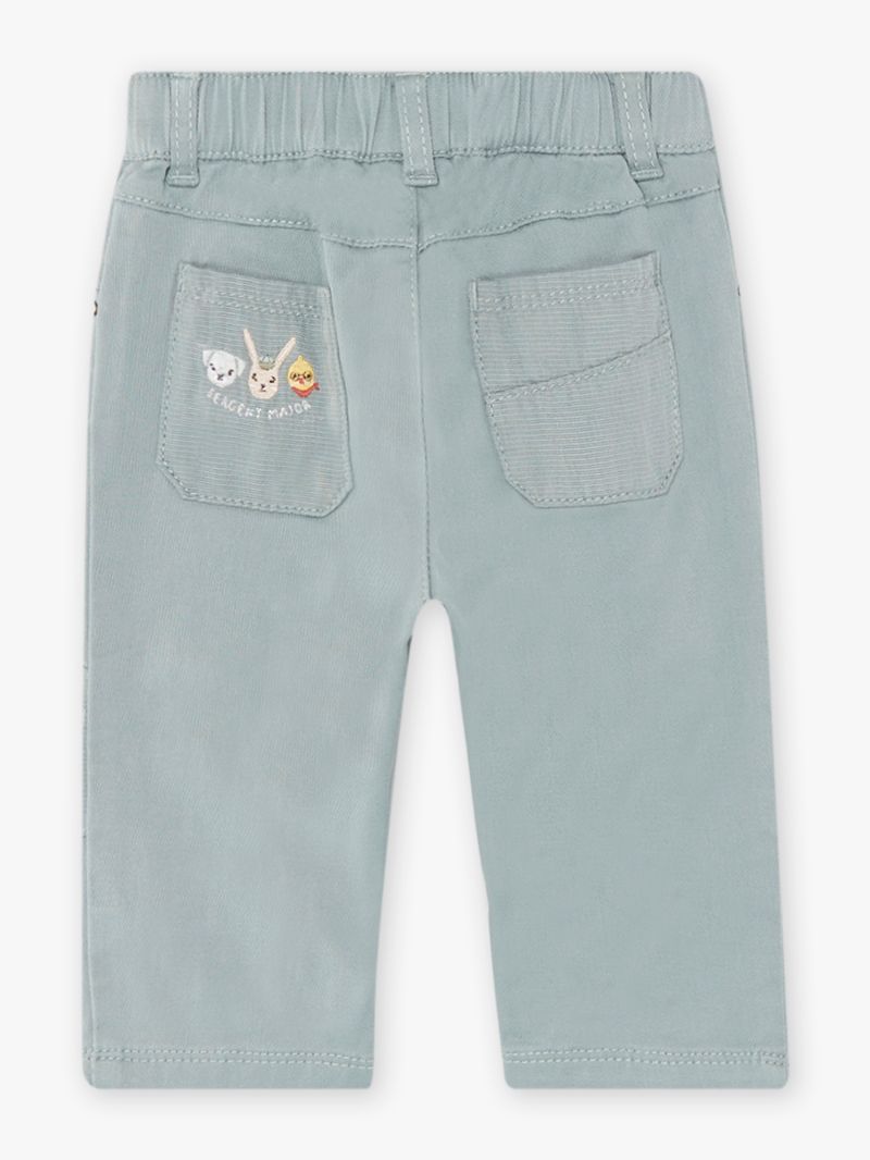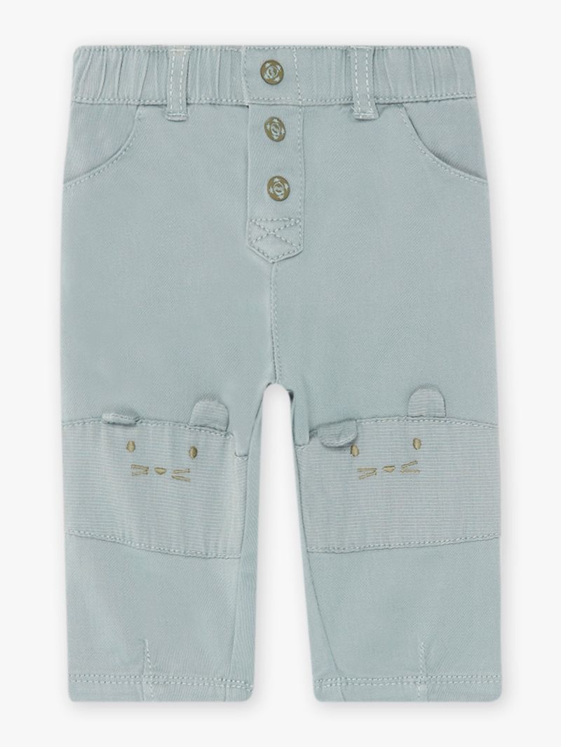 Панталони от тъкан памук в пастелен цвят, с покрит ластик на талията, закопчаване с копчета тик-так в предната част, два предни и два задни джоба, единия от които с бродерия на животинки. Мотиви на зайче с релефни ушички на коленете, комфортна и еластична материя.