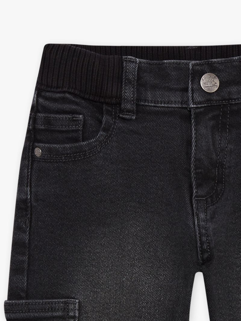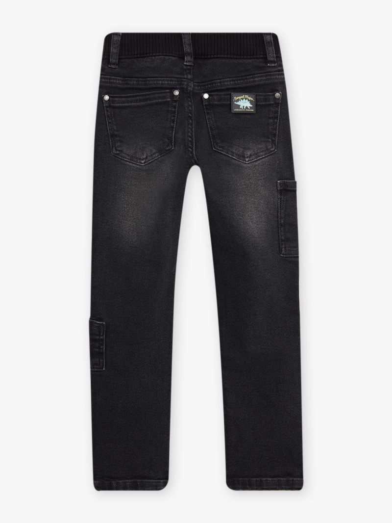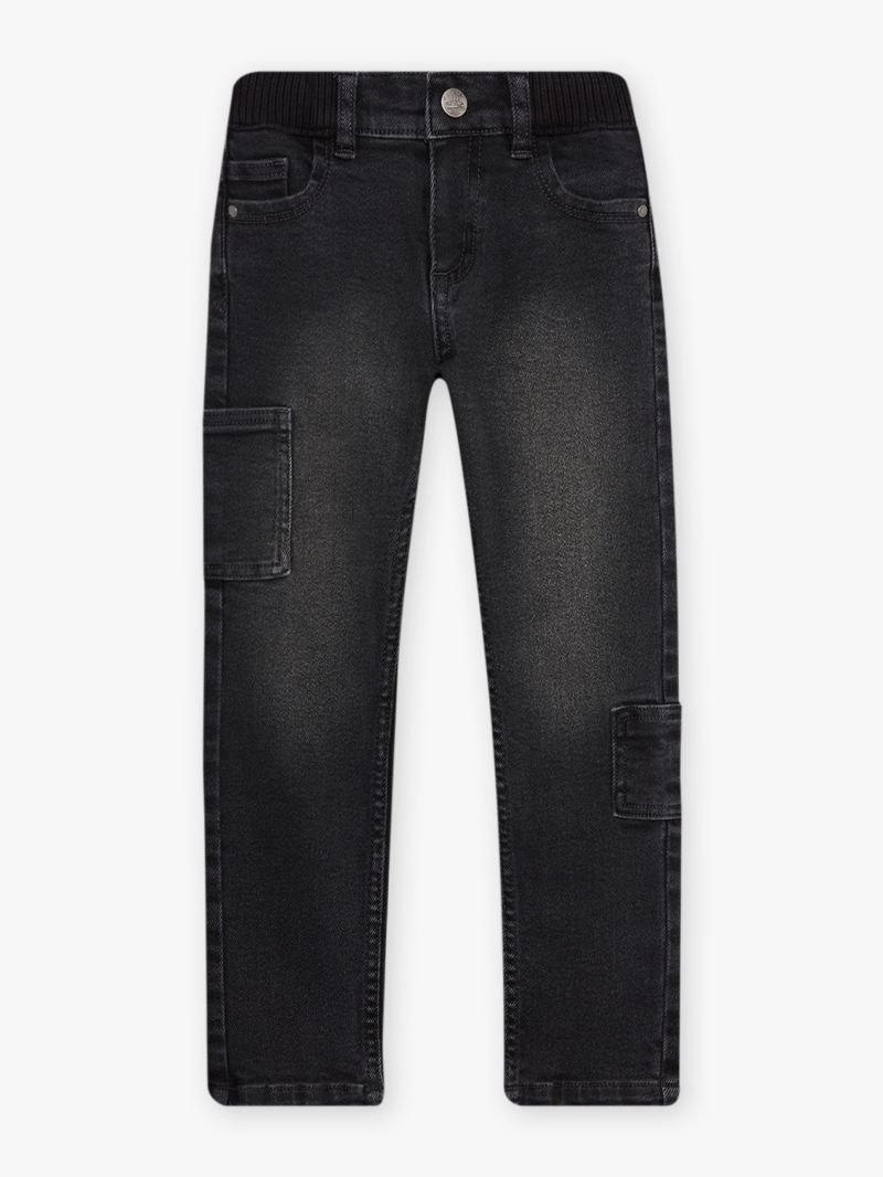 Дънки от гъвкав деним с тясна кройка, шест джоба, регулираща се талия с ластик и крачоли с прави краища. Закопчават се с цип и копче, два предни, два задни и два странични джоба.