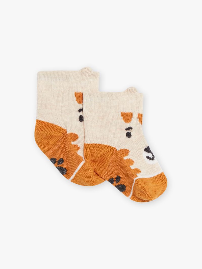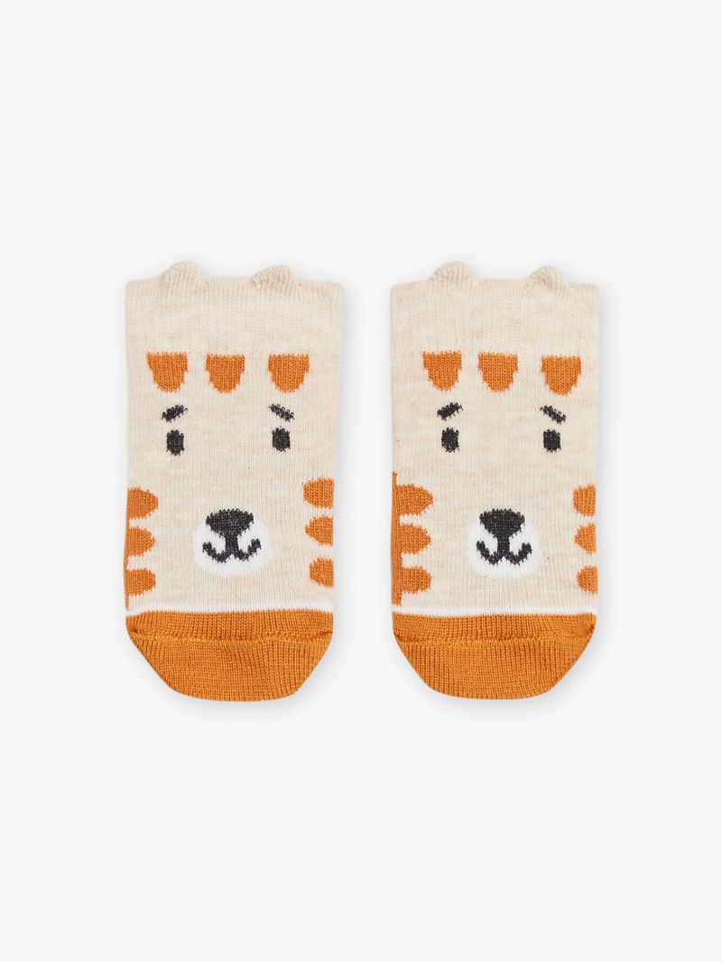 Къси чорапи от мека памучна смес в светло бежов цвят, оранжеви мотиви, муцунка на тигър в предната част