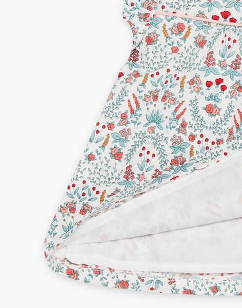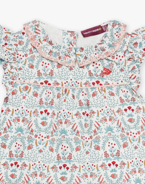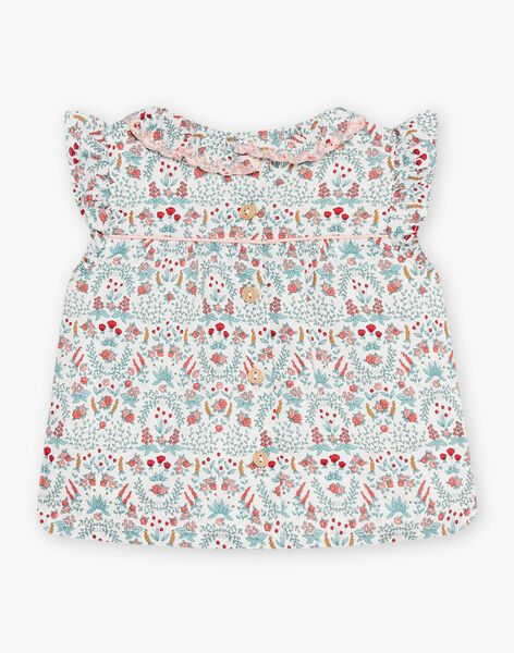 Клоширана блуза от тъкан памук във флорална материя с набран шев в горната част и малка брошка на гърдите. С елегантна яка с английска бродерия , без ръкави, с волани по раменете и копчета по дължината на гърба.