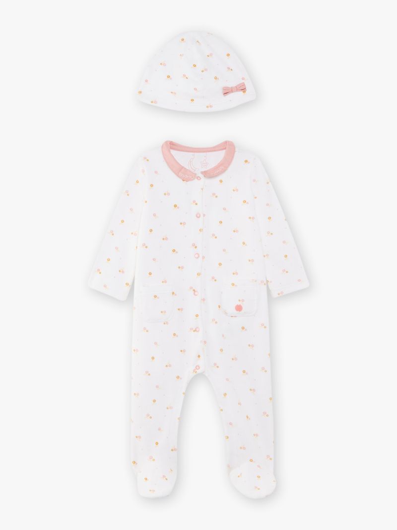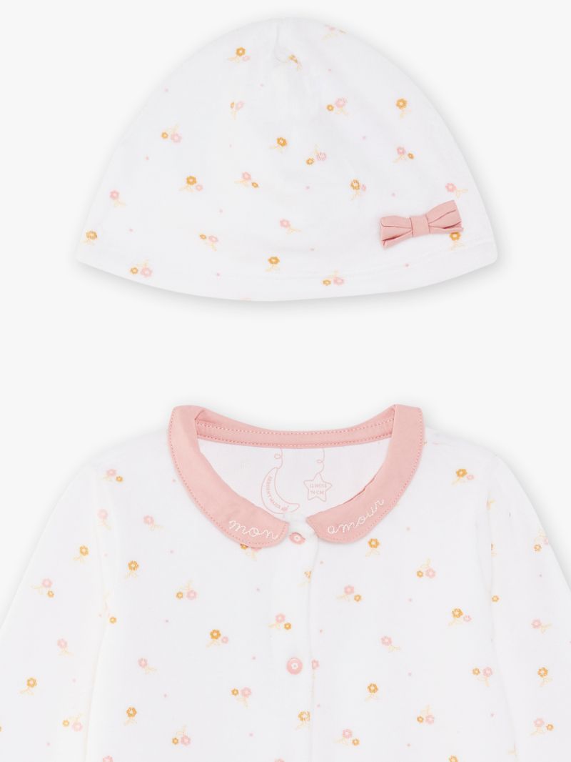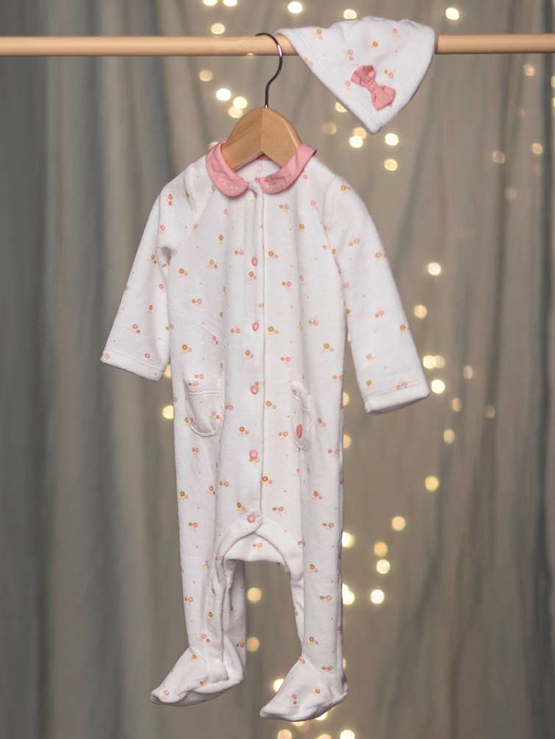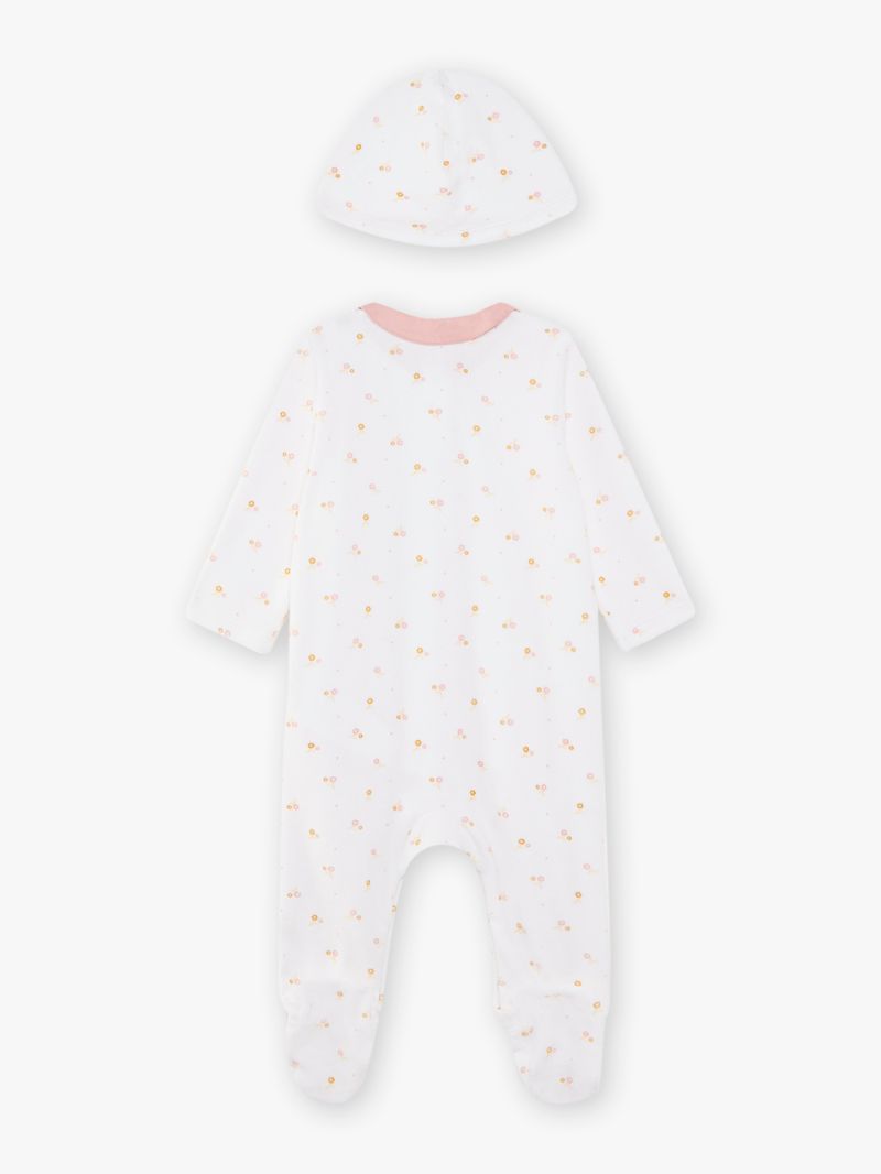 Ромпър плюш от мека памучна смес в основен цвят екрю с цветен принт. С контрастираща яка тип Питър Пан с бродирани надписи mon amour. Закопчаване с копчета тик-так по дължината отпред и от вътрешната страна на крачолите, цели стъпала и два предни джоба. В комплекст с мека шапка с цветен принт и панделка.