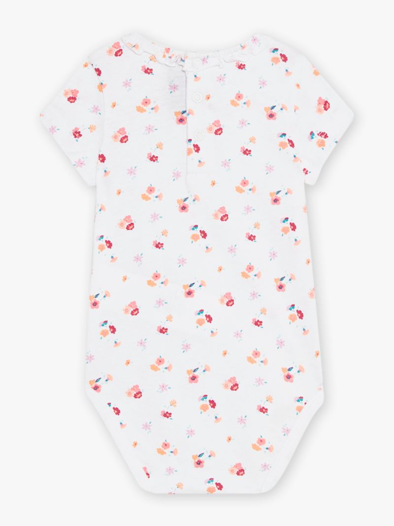 Боди от мека памучна материя с флорален принт. Закопчаване с копчета тик-так на отзад на гърба и на дъното. Ефектна яка с волани.
