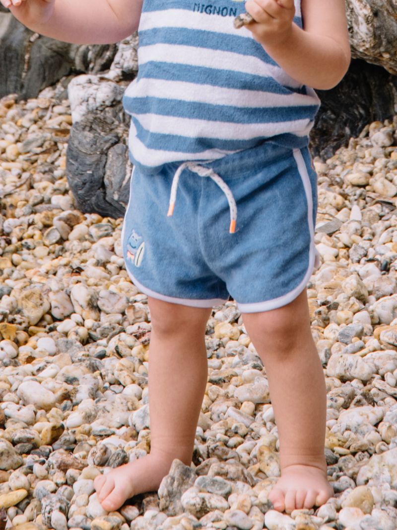Памучни къси панталони в син цвят с талия с ластик, с усукана връзка с пристягане.. Бродерия хипопотам отпред и заоблени краища на крачолите с контрастни бели кантове отстрани и в долната част.