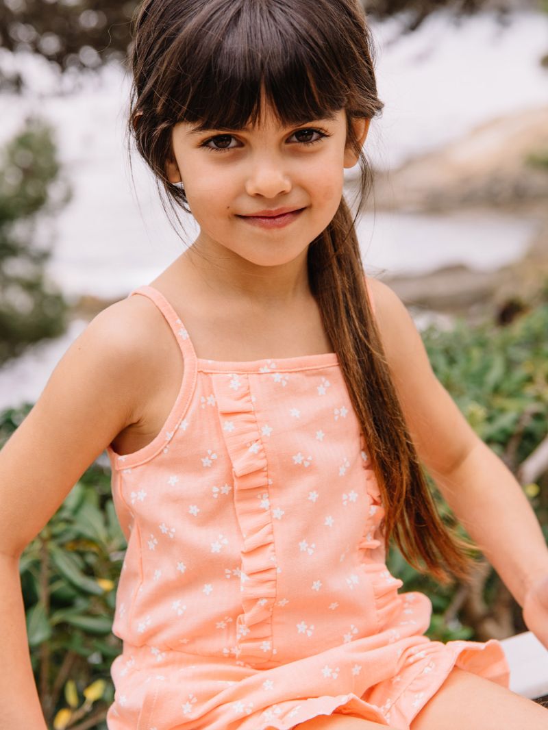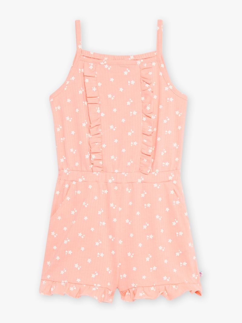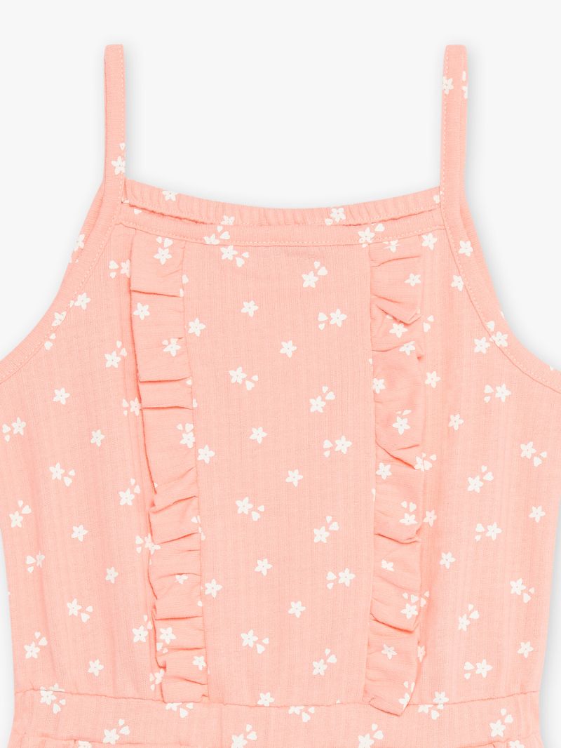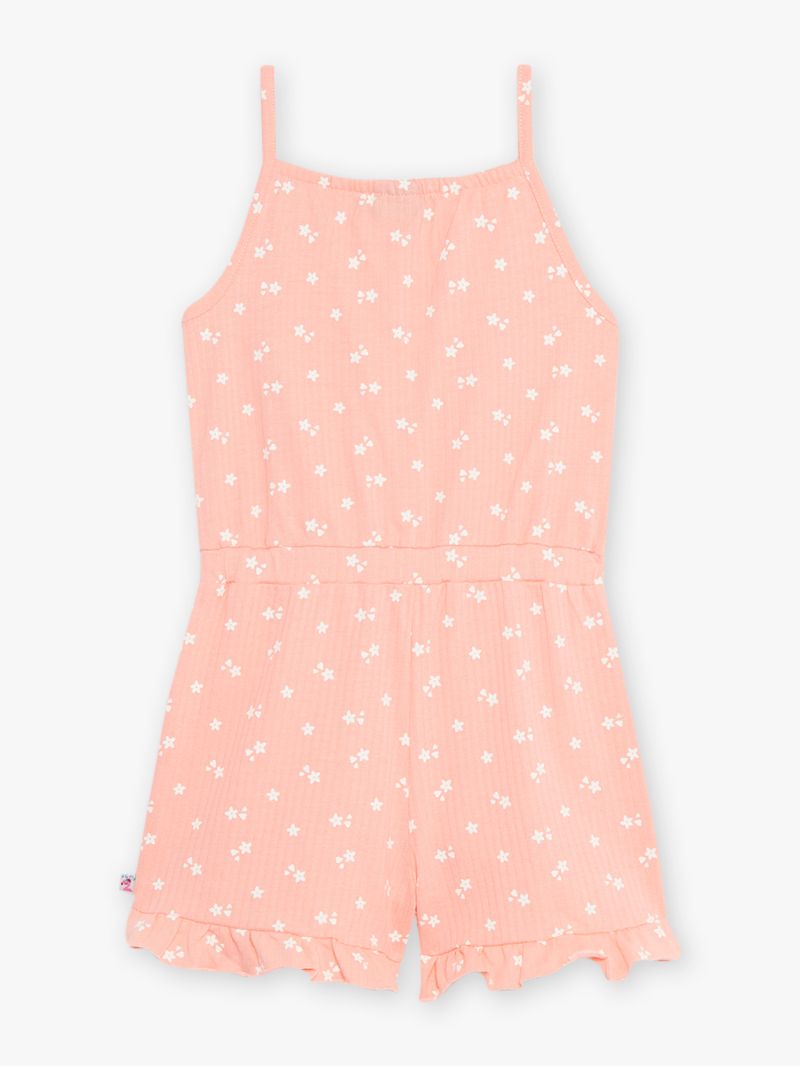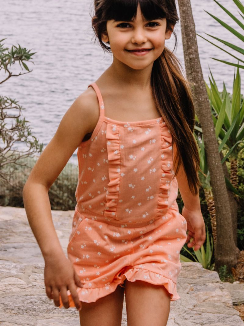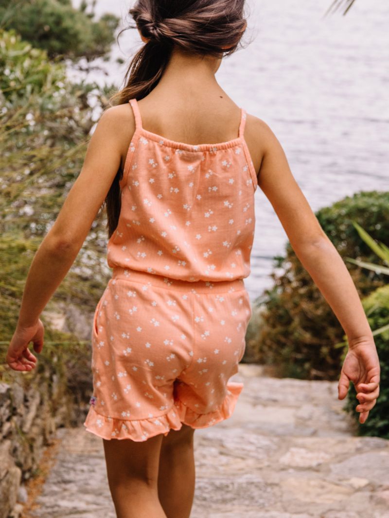 Къс гащеризон от тъкан памук в цвят корал с десен. Тънки презрамки, шев с тесен ластик на талията и два странични джоба. Ефектни волани в предната част и на крачолите. Лека и комфортна материя.