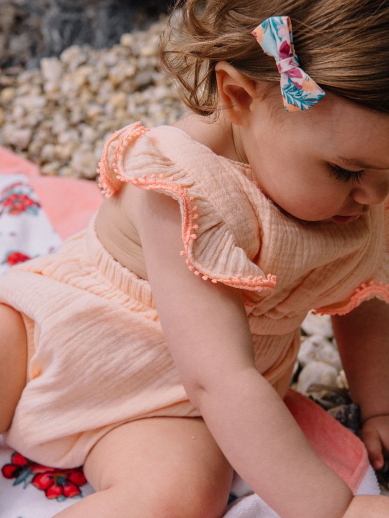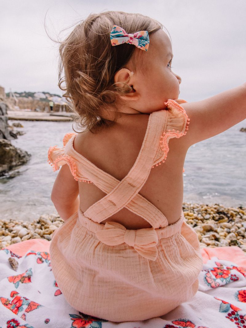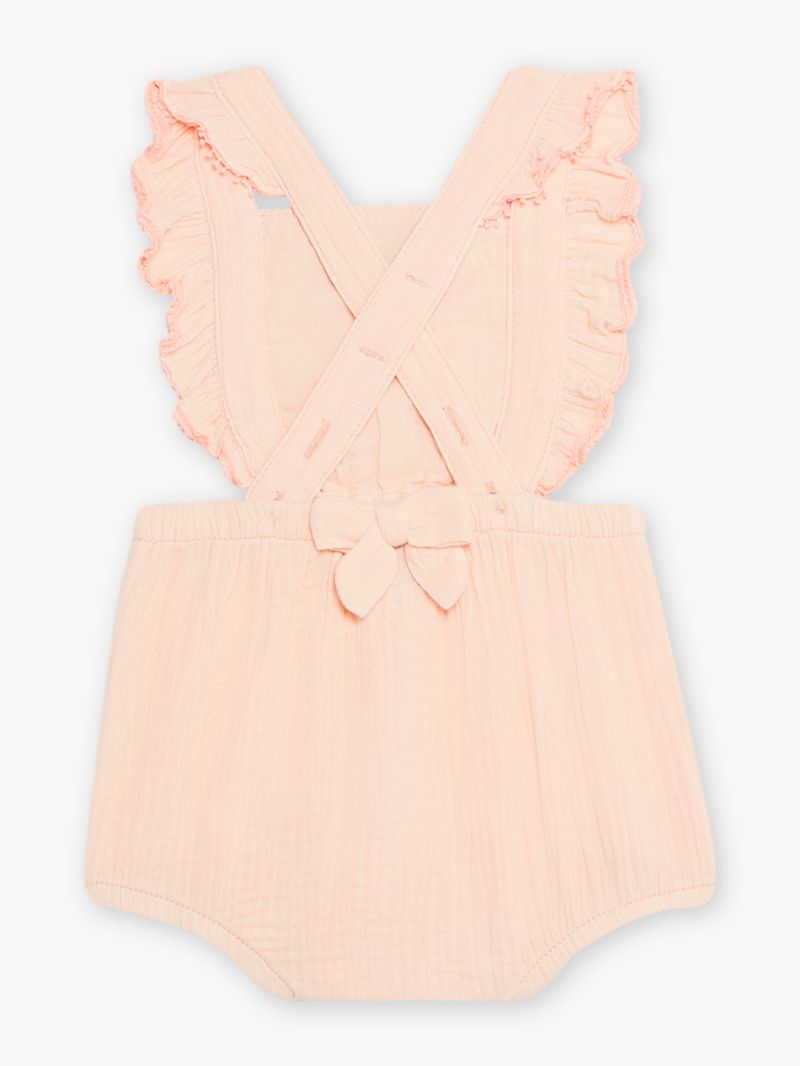 Къс памучен гащеризон в розов цвят. С презрамки, кръстоващи се на гърба и регулиращи се с копчета от вътрешната страна на талията, с волани по дължината им. Бродирани цветя в предната част и панделка на гърба. Закопчаване с тик-так копчета на дъното. Скрит ластик на талията и крачолите. Мека и комфортна материя.