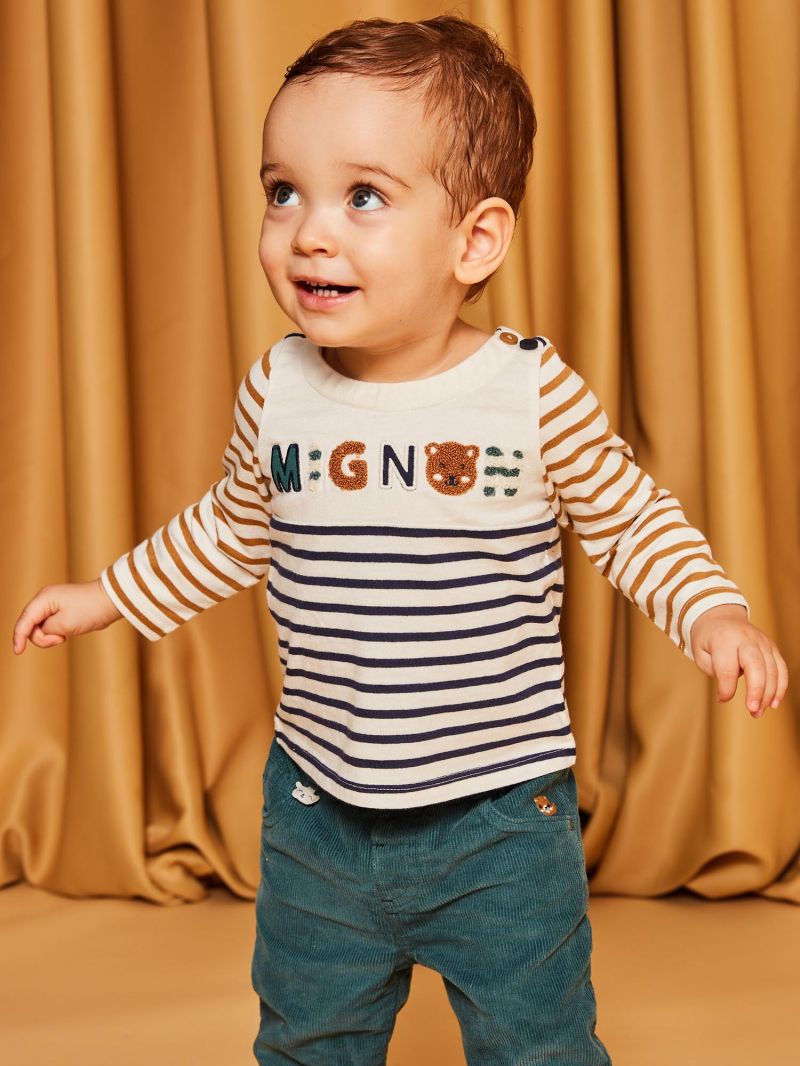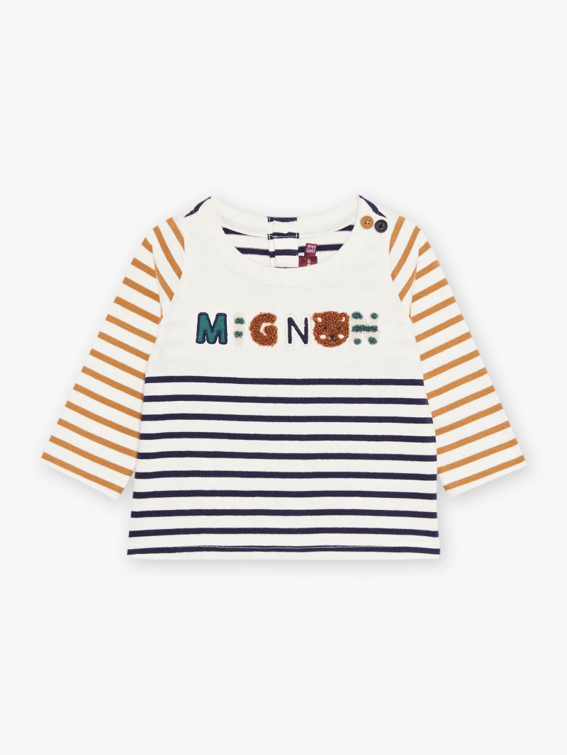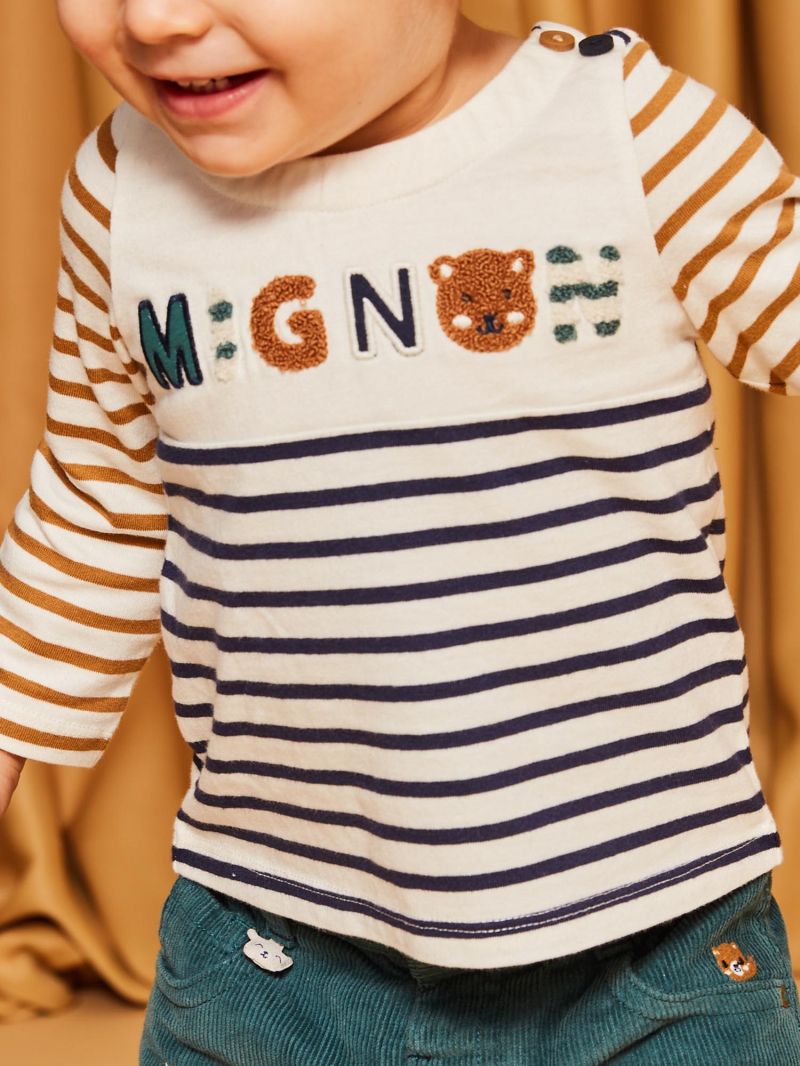 - Надпис MIGNON на гърдите в съчетание на бродерия и тъкан букле