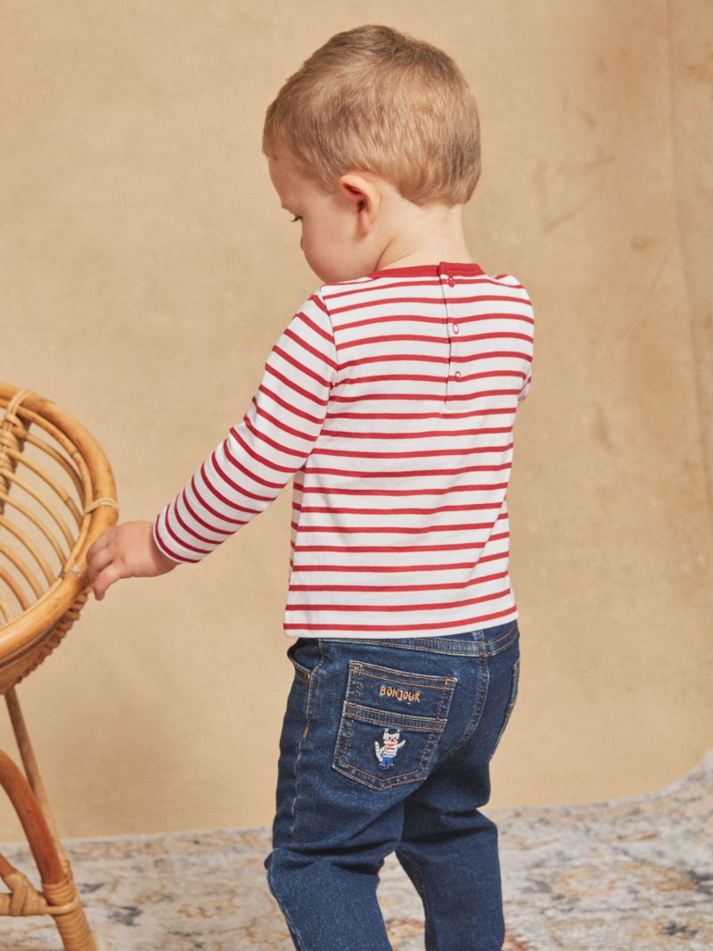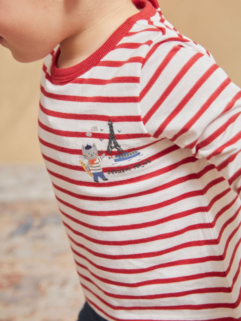 - Материя от мек памук в основен бял цвят с десен на червено райе