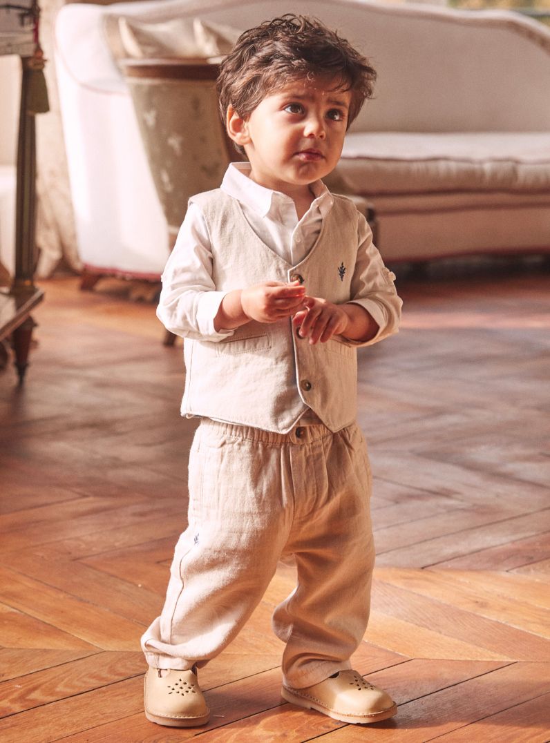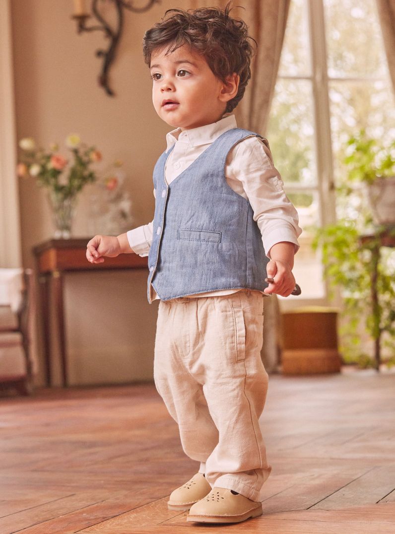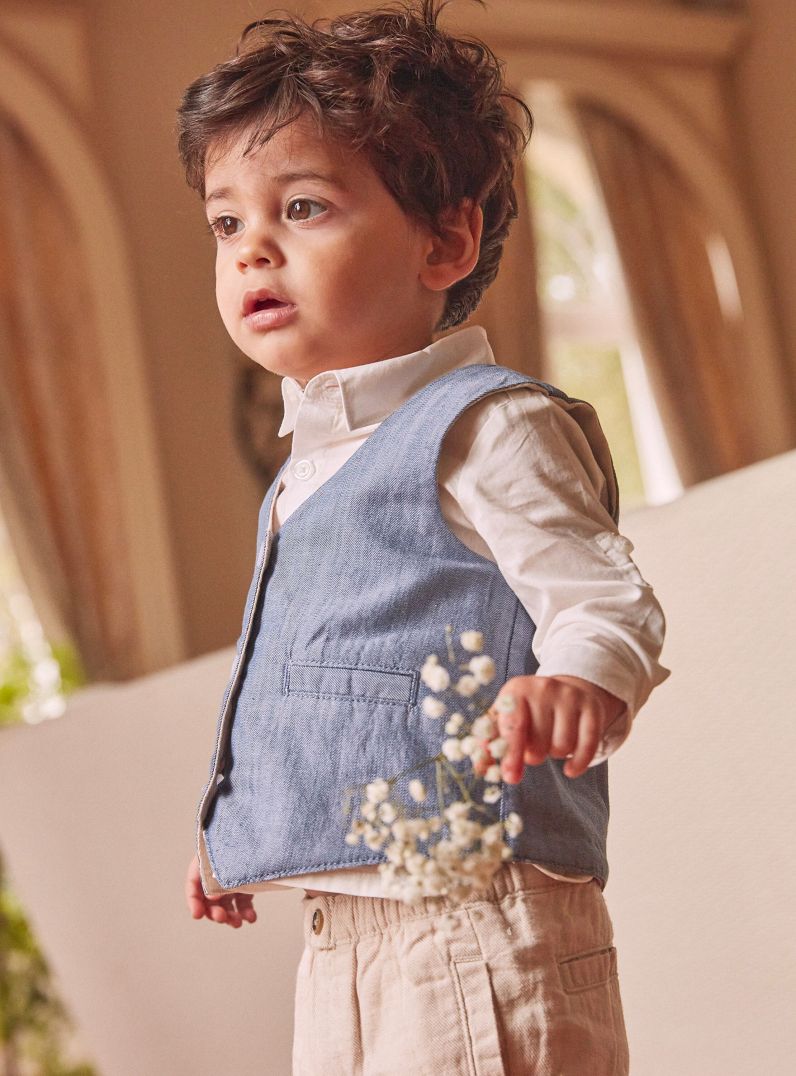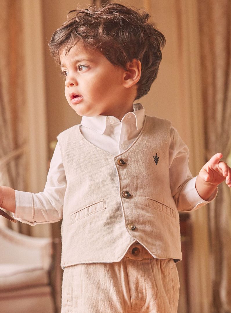 Този шикозен елек от кепър представлява елегантно обновление на класическата кройка на костюмнен елек, за да създаде изискан официален ансамбъл. Този елек предлага две страни - бежова и синя, което позволява да се комбинира с ленени бежови панталони от кепър в координирана или контрастираща визия, за да се създаде модерен официален тоалет.