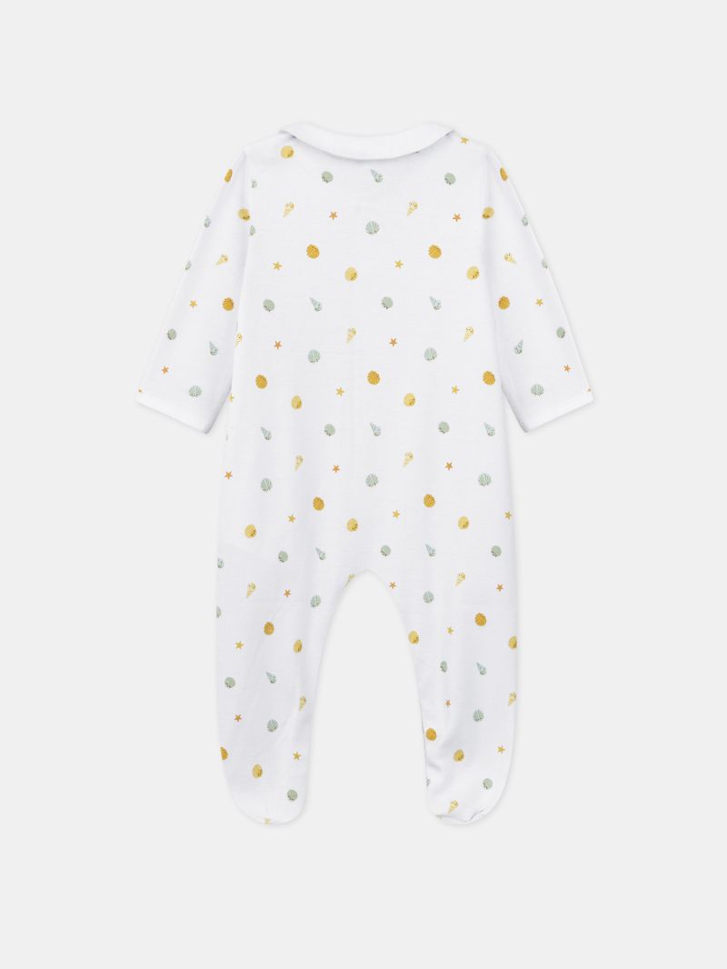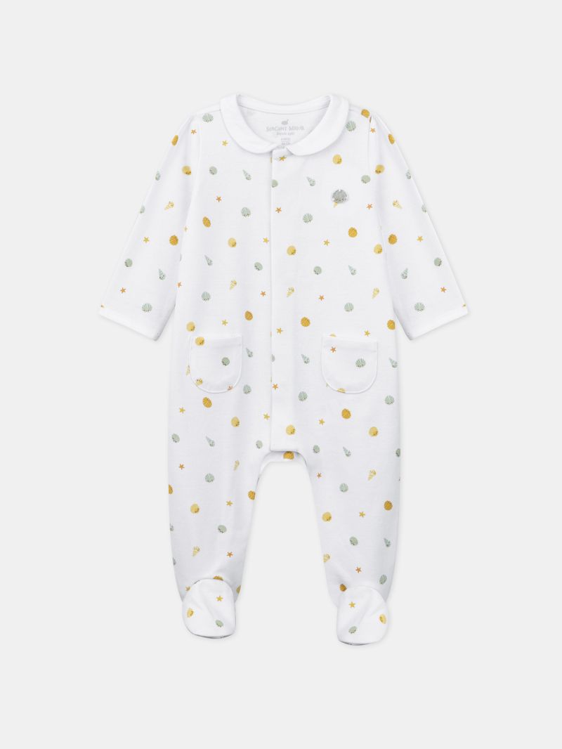 Пижама от материя интерлок в която се преплитат магията и нежността на морето. Чудесната яка в стил Питър Пан, изработена от меко трико в цвят екрю и с два малки отворени джоба отпред, придават на тоалета елегантен завършек. С копчета тик-так за закопчаване по дължината отпред обличането става с лекота, позволявайки на вашето малко съкровище да се движи свободно. А приложената подаръчна картичка във формата на мида- перла, я прави идален избор за подарък за новородено.