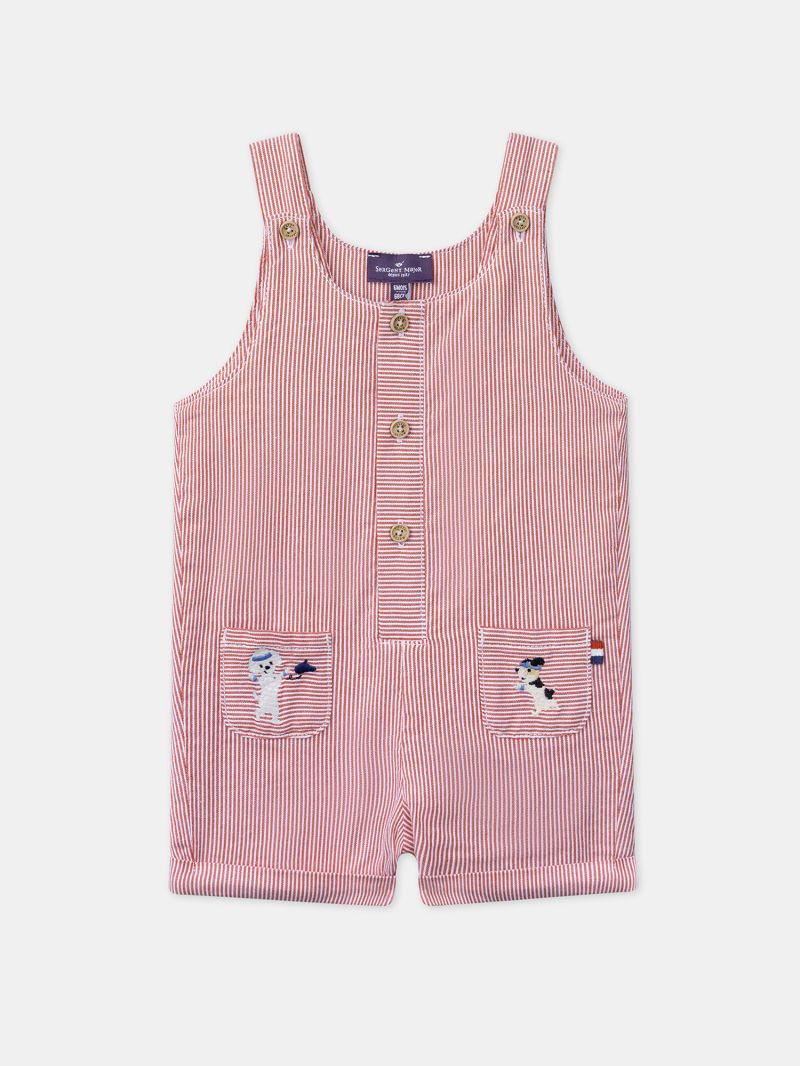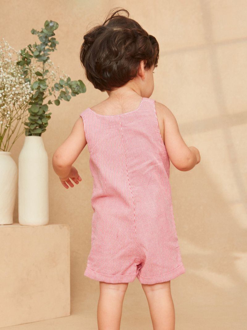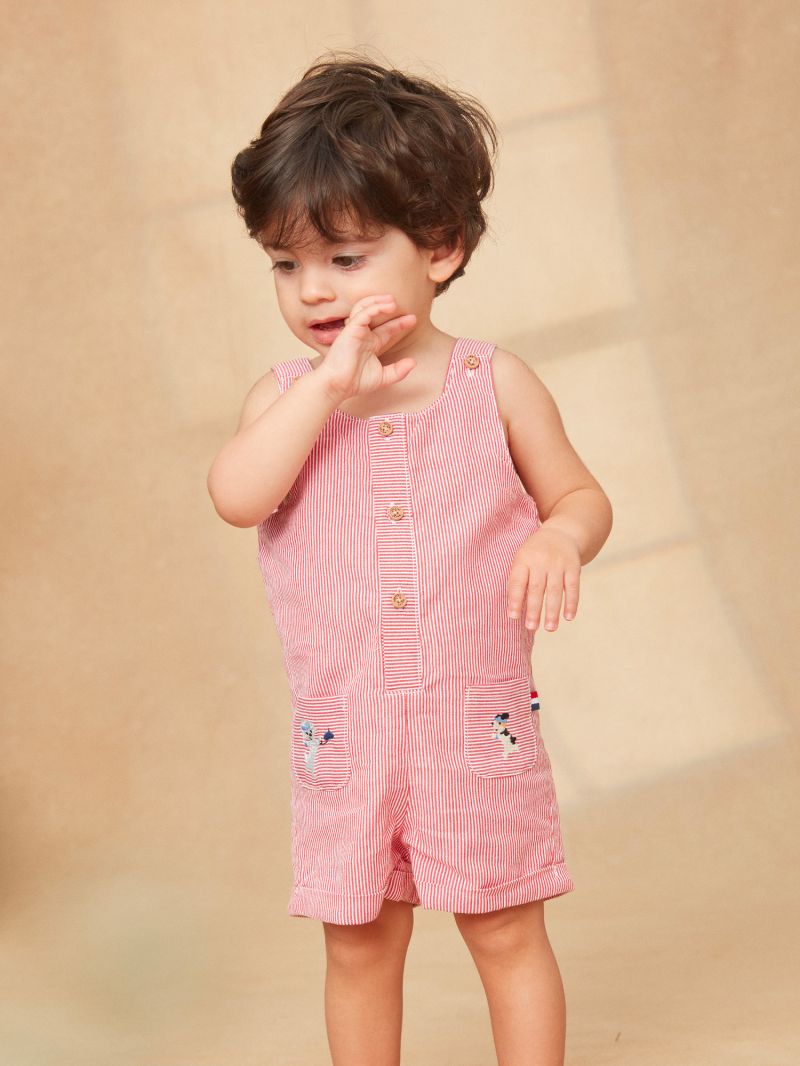 Този къс гащеризон за бебе момче излъчва свеж ретро вид. Със своя десен на фини червени и бели ивици, той връща духа на 60-те години, като предлага едновременно класически и съвременни детайли. Кройката му е вдъхновена от винтидж стила на миналото, допълнена със забележителни акценти като дървени копчета и джобове с кръпки отпред. Бродираният мотив на кученце, придружен от трицветно знаме, ни отвежда в атмосферата на Олимпийските игри в Париж. Завършета аутфита, като го съчетаете с изчистена тениска.