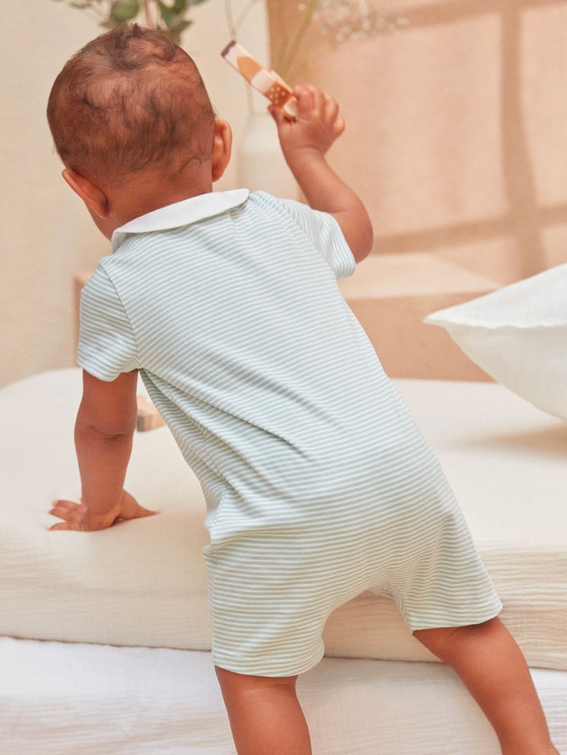 - Материя от тъкан памук с десен на райе в цвят екрю и тюркоаз