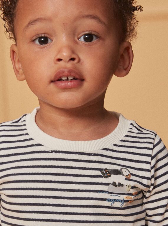 Тази лека и удобна блуза е незаменима част от есенно-зимния гардероб на вашето малко момче. Десенът на райе в нюанс на синьо и екрю добавят нотка свежест и жизненост, докато текстурираният мотив на пингвинче на гърдите добавя закачлива нотка. Откопчаването с копчета тик-так на гърба улеснява обличането, предлагайки практичност и комфорт на родителите и детето.