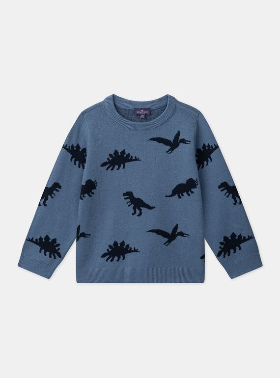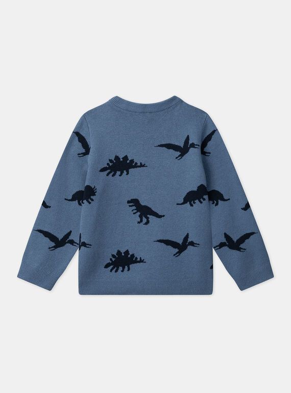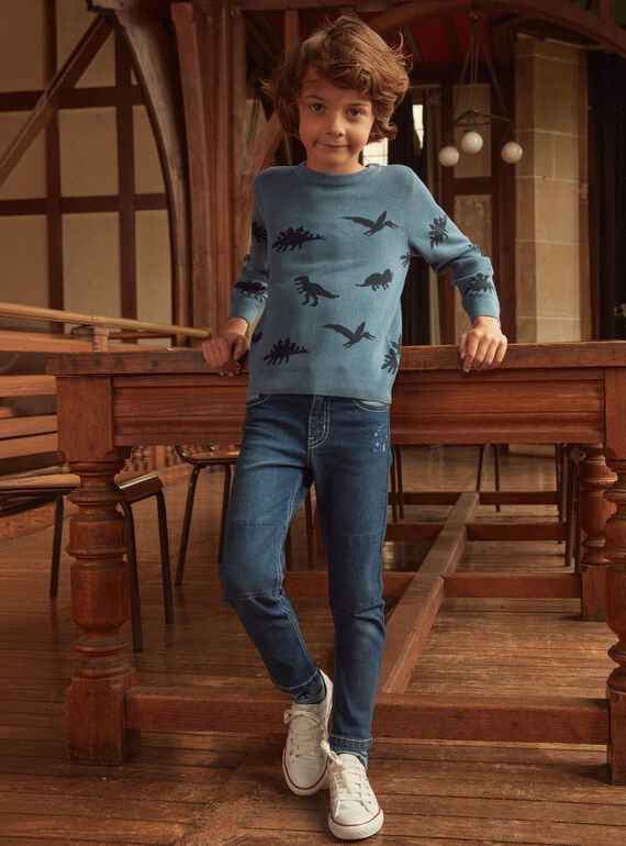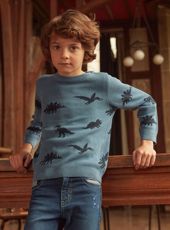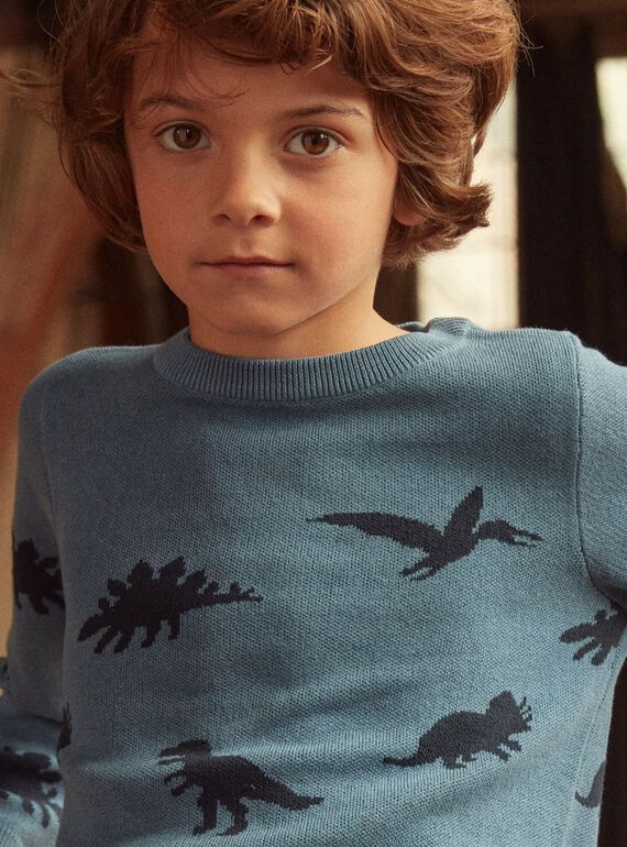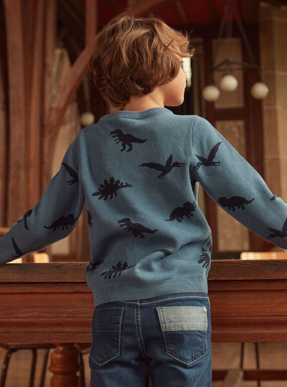 Този жакардов пуловер с тематичен десен е перфектен за малките любители на динозаврите. С оригиналните си мотиви на динозаври, вплетени в жакарда, той съчетава забавен дизайн с уникален стил. Рипсените краища на яката, маншетите и талията осигуряват удобно и стегнато прилягане, което допринася за комфорта през целия ден.