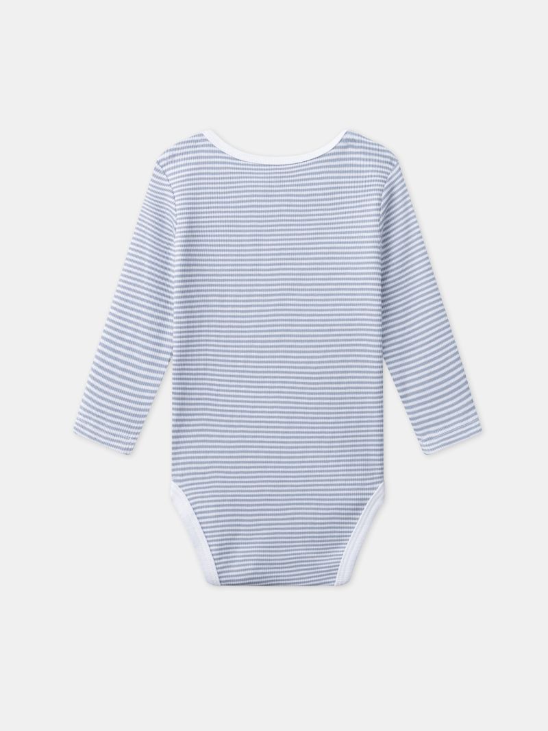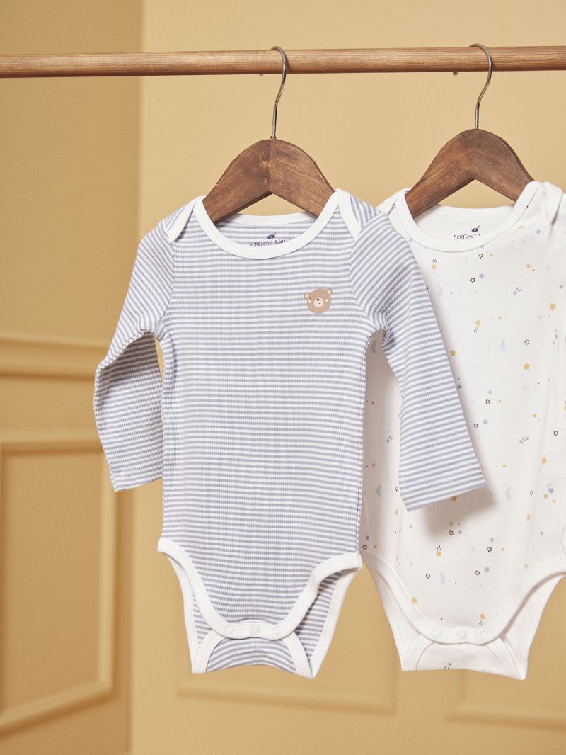 - 1 рипсено боди с фино райе в сиво-синьо и екрю, декорирано с мотив на муцунка на кафяво мече на гърдите – идеално за малките любители на животни.