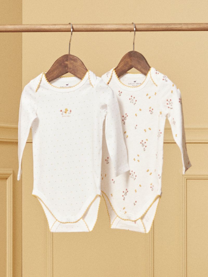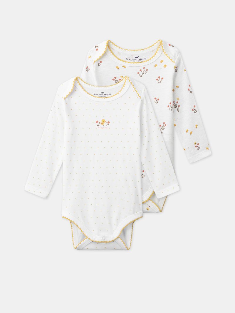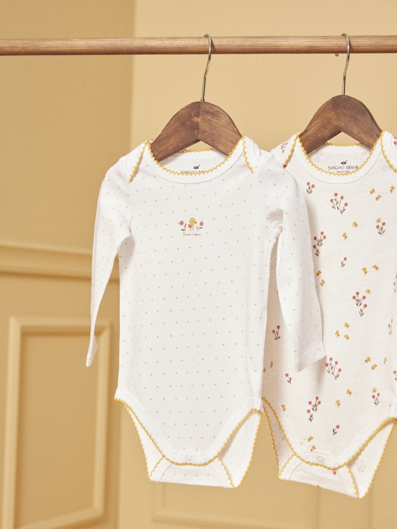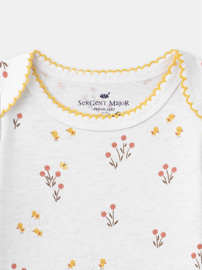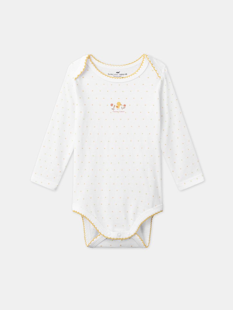 - 1 боди с десен на жълти точки с мотив на гърдите на малко пиленце с цветя в нюанси на жълто, оранжево и червено, придружен от надпис "Poussin d'amour". Яката също е украсена с нежни жълти пико финиши.