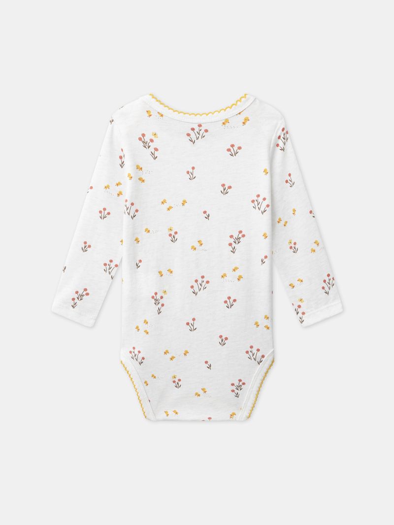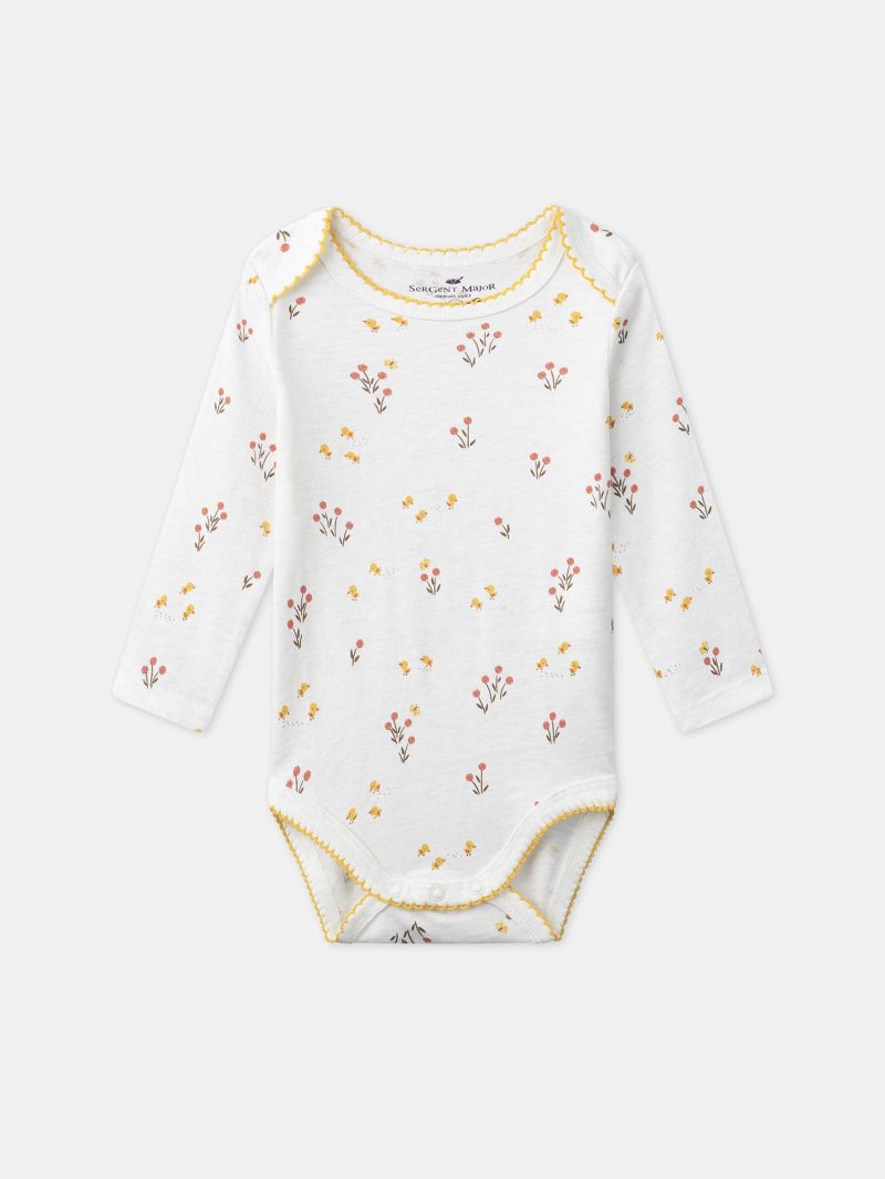 - 1 боди с десен на малки пиленца и цветя в топли нюанси на жълто, оранжево-червено и кафяво. Бедрата и яката са завършени с деликатни контрастни акценти от пико, придаващи нежен и елегантен щрих.