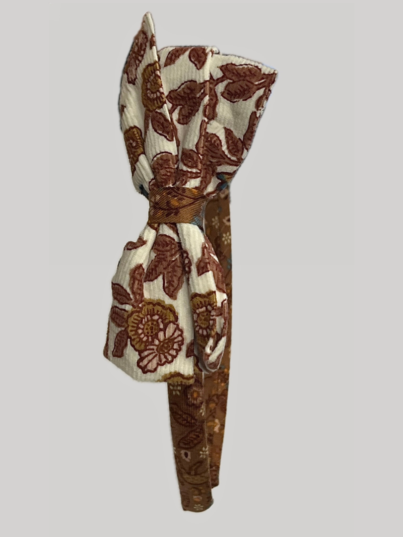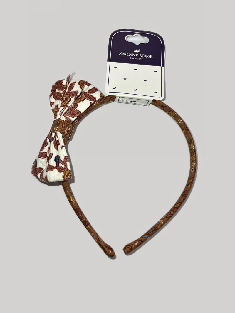 - Диадема, покрита с текстилна рипсена материя, която осигурява удобно прилягане и предотвратява всякакъв дискомфорт или дразнене по време на носене с флорален десен в нюанси на цвят екрю и кафяво