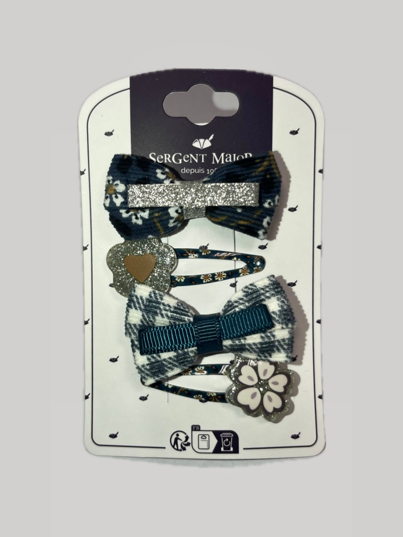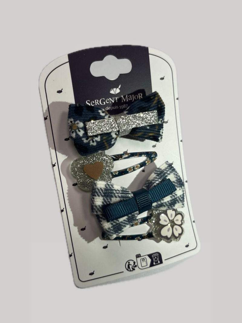- 1 брой фиба за коса с декоративна панделка с рипсен флорален десен, украсена със сребрист акцент под формата на двойна панделка.
