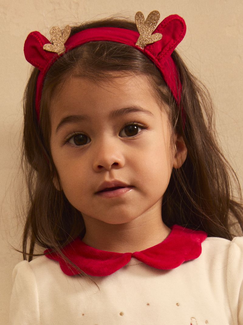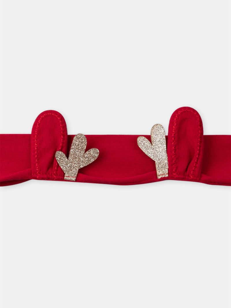 Продава се с коледна лента за глава в червен цвят с 3D ушички и мотив на златисти еленови рога