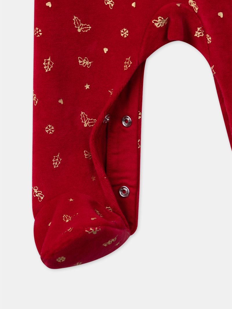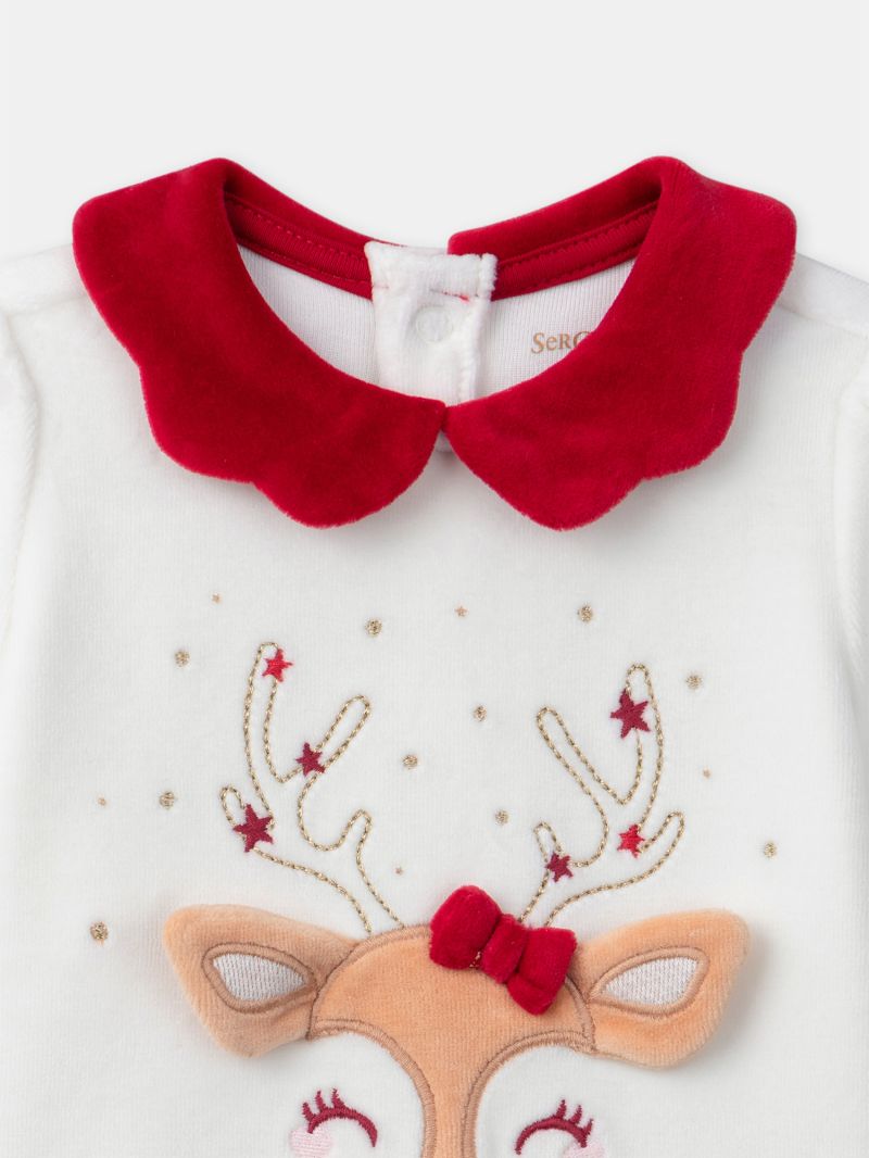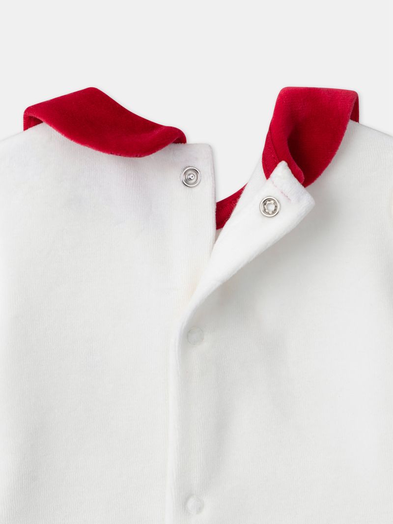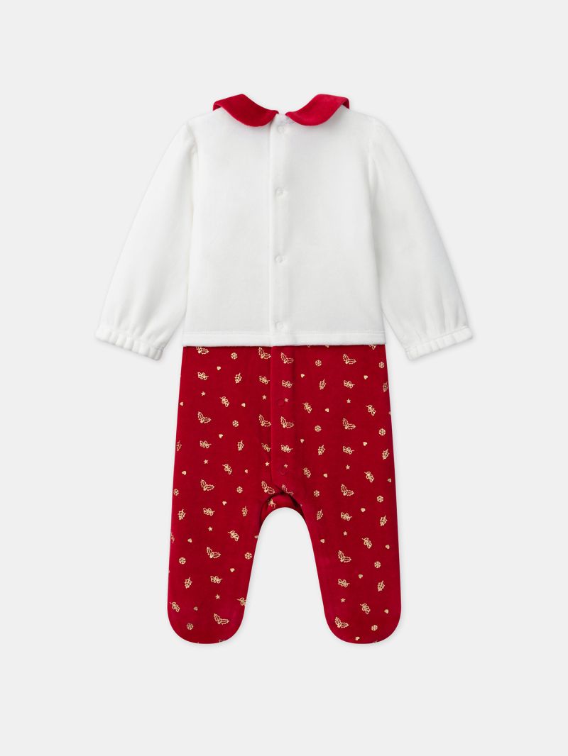 - Ромпър от плюшена материя в основен цвят екрю в горната чат и червен в долната част, с тематичен мотив