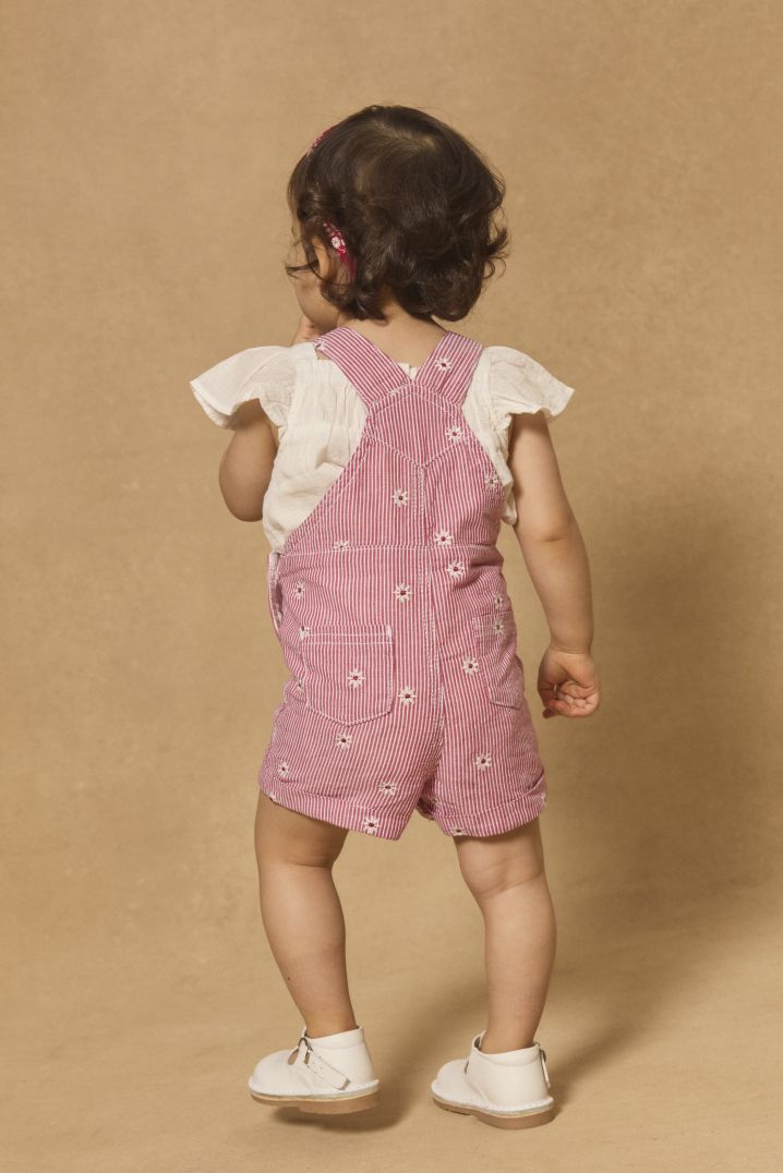 Този къс гащеризон е преобразен в ултра момичешка версия! Излъчващ романтика и сладост, този модел с десен на райе оживява с множество малки бродирани мотиви на цветя в контрастен цвят. джобът на гърдите с малка текстилна апликация с надпис „Baby 1987 Sergent Major“ и предните и задните джобове добавят практично и очарователно докосване. Комбинирайте аутфита с бяла блуза или боди и завършете визията.