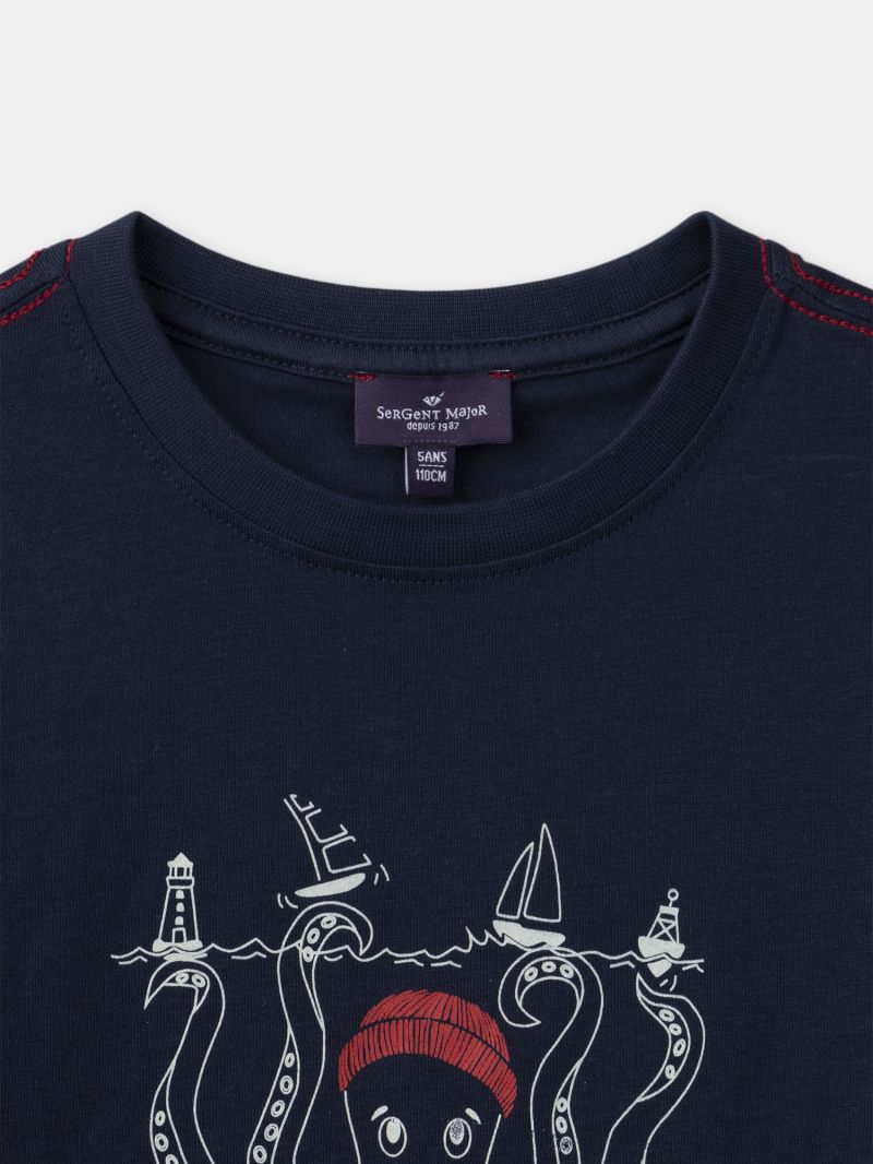 С къси ръкави, кръгло деколте и лека материя в тъмносин цвят, която позволява свобода на движение, тази тениска представлява перфектно съчетание на стил и комфорт. Тематичния мотив на октопод отпред, предават нотка забавление на модела и авантюристичен вид. Носете тази тениска с панталон или дънки и се впуснете в приключение.
