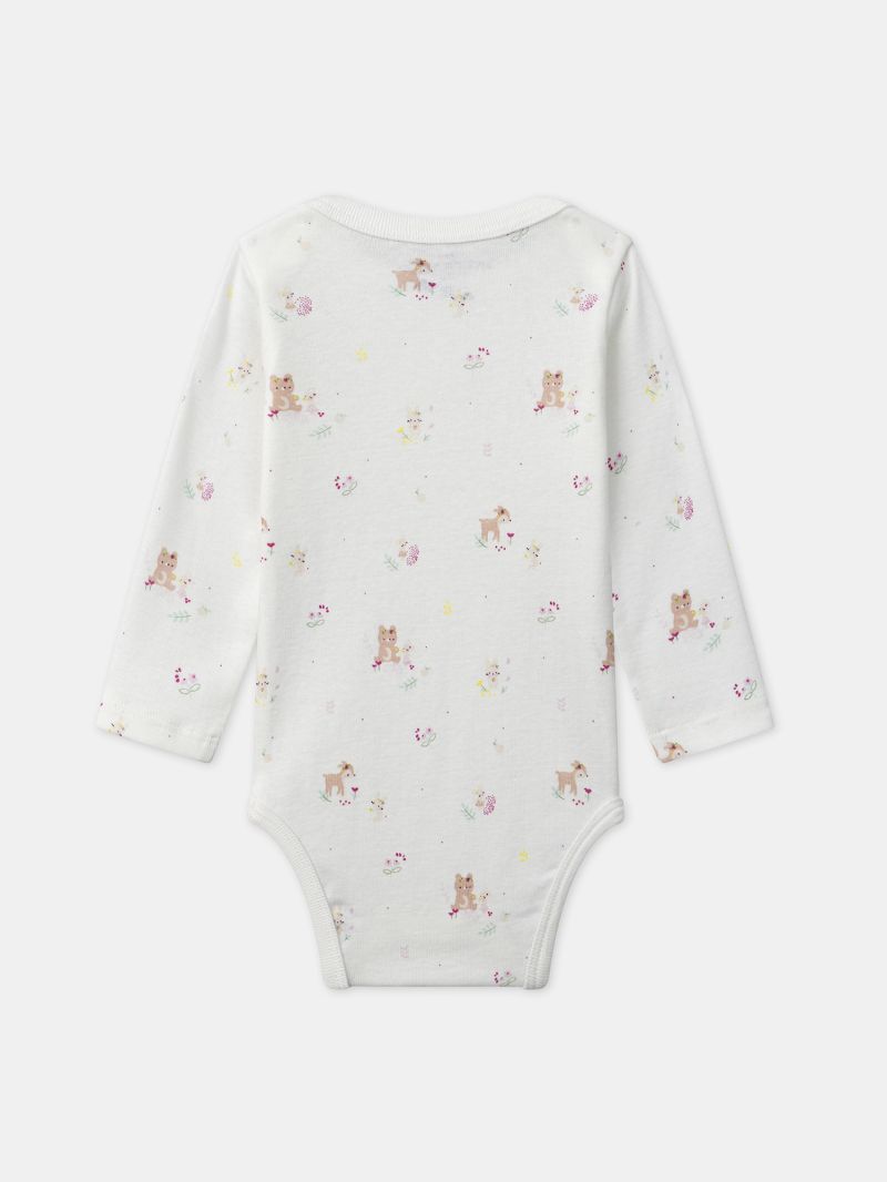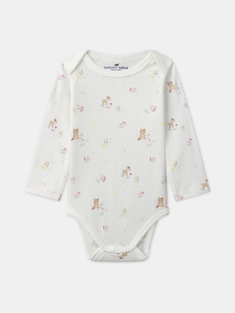 - 1 боди в основен цвят екрю с десен на горски животни и цветя в нюанси на тъмнобежово, светлобежово, розово, жълто, нежно зелено и фуксия с финиш пико за очарователен акцент