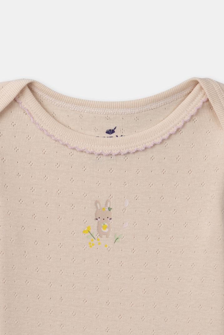 - 1 рипсено боди в розов цвят с мотив на нивотона гърдите на зайче и цветя в тъмно бежови, жълти и зелени тоновес деликатно пико в придавайки елегантен завършек.