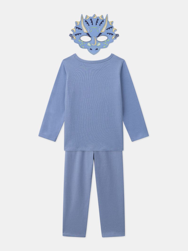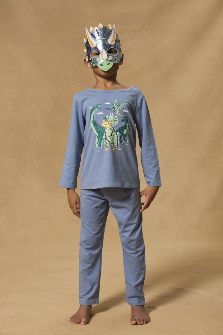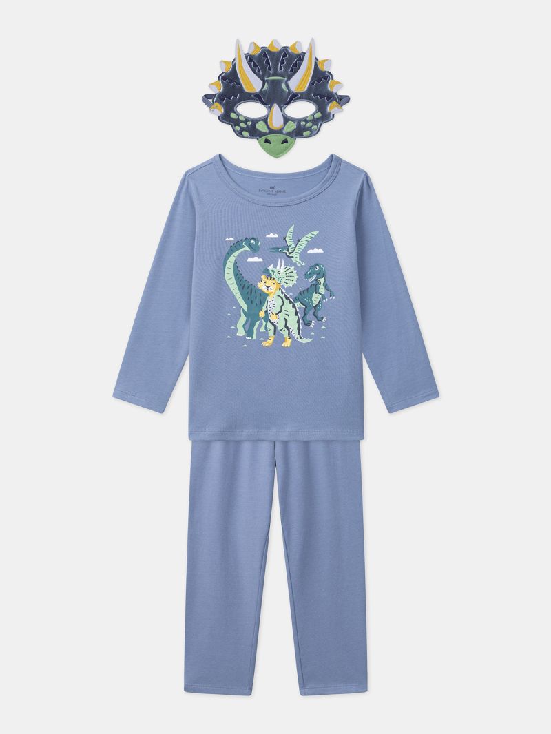 Вдъхновен от вълшебството на динозаврите, представяме ви пижамен комплект Triceratops Print Triceratops Mask Pajama Set, специално създаден за малките приключенци, които обичат праисторическите същества! Горнището е с ярък и забавен мотив на трицератопс, а към комплекта има и маска за лице в същата тематика – за още по-забавно време преди лягане или игри у дома.