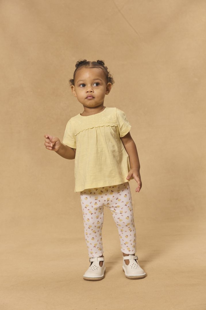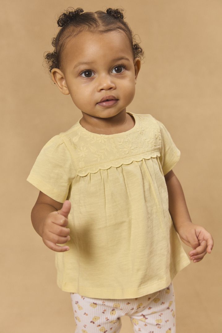 Тази блуза в топъл цвят, с деликатна флорална бродерия, осигурява свобода на движение на вашето малко момиченце и е перфектното допълнение към тоалетите от гардероба на всяка малка принцеса. С ефектното си деколте тази блуза излъчва изключителна елегантност и стил. Пълно откопчаване с копчета тик-так по дължината на гърба, което улеснява обличането. Препоръчваме да носите тази блуза с подходящи панталони или клин за да създадете завършена визия.