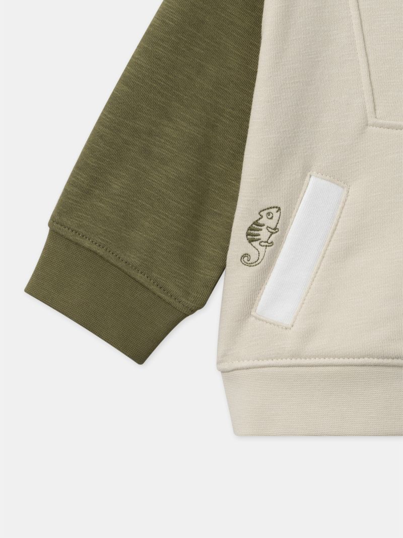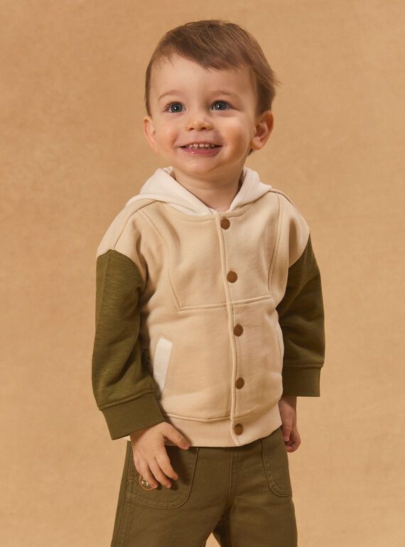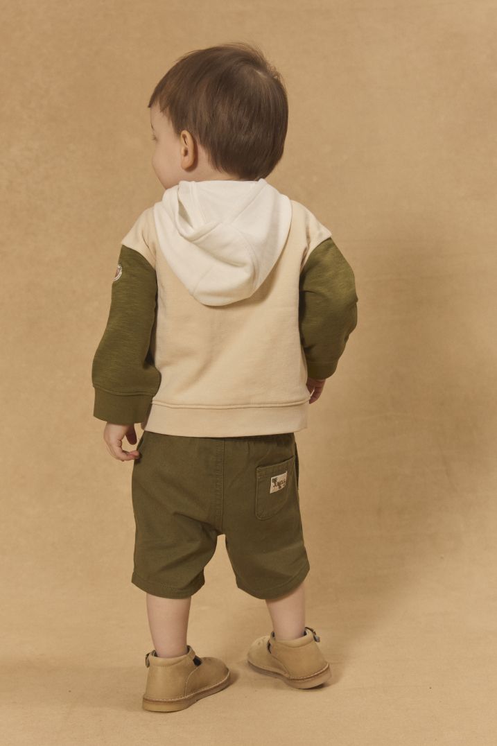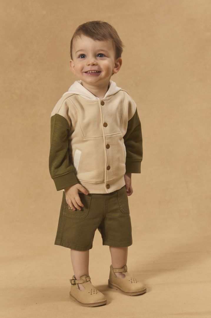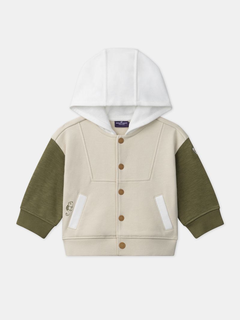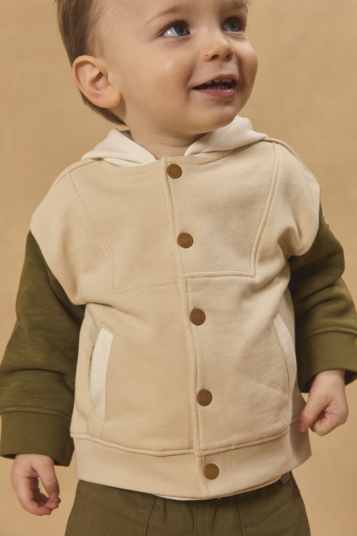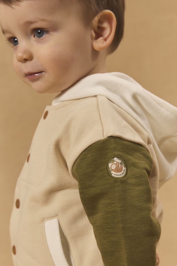 За малките откриватели този трицветна жилетка с качулка е чудесен избор за прохладните дни. Съчетавайки удобство и стил, тя впечатлява с контрастни ръкави в цвят каки, качулка и обкантени джобове в цвят екрю, а малката текстилна аплокация с мотив на коала придава чаровен акцент. Практичното закопчаване с копчета тик-так прави обличането бързо и лесно.