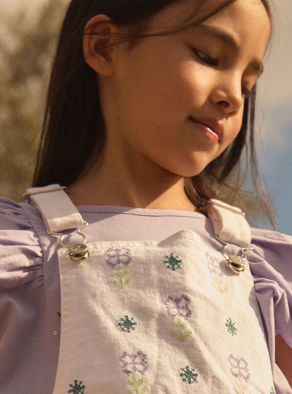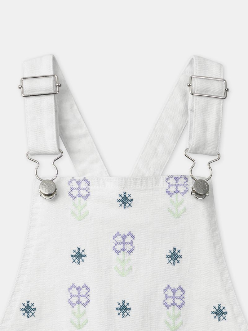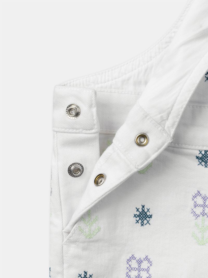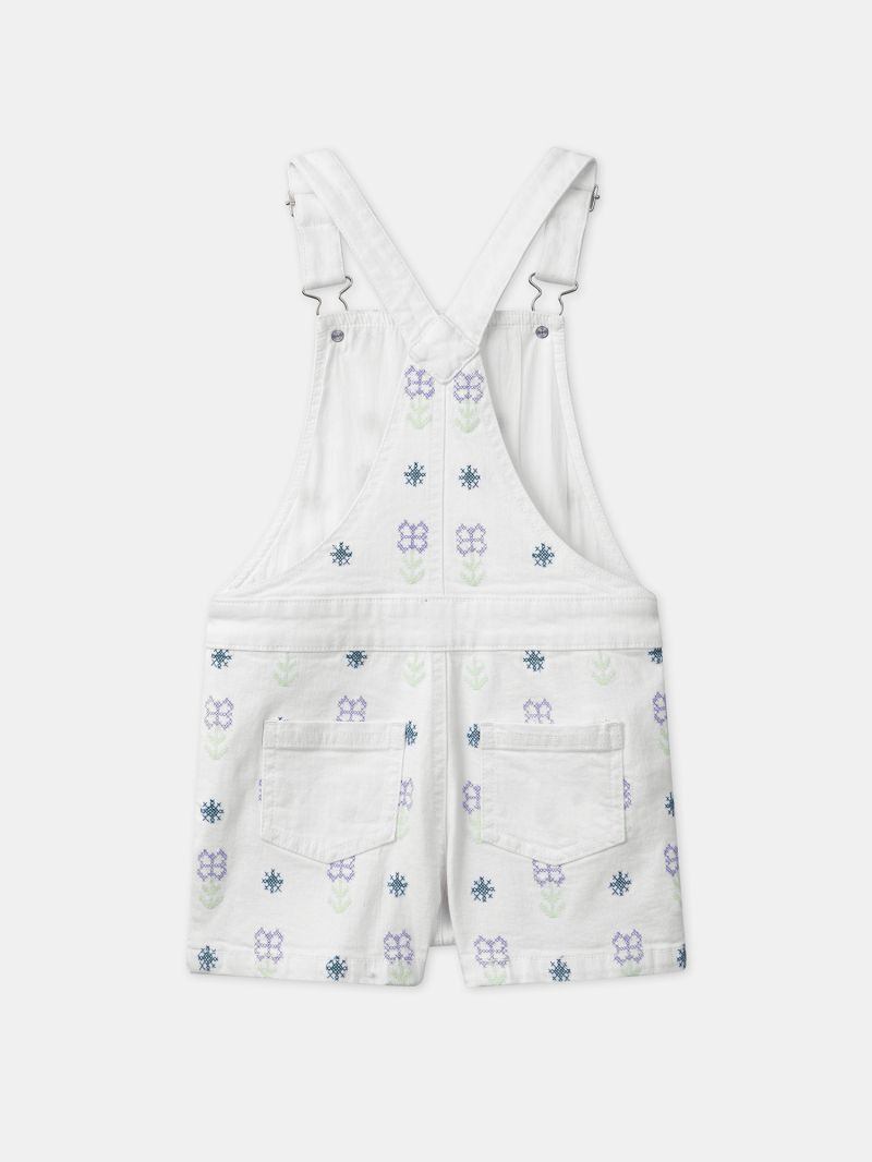 Този къс гащеризон е идеалният избор за слънчевите дни. Флоралната бродерия с кръстат бод добавя рустик щрих а предните и задните джобове добавят практично и очарователно докосване. Комбинирайте аутфита с лилава блуза от колекцията и завършете визията.