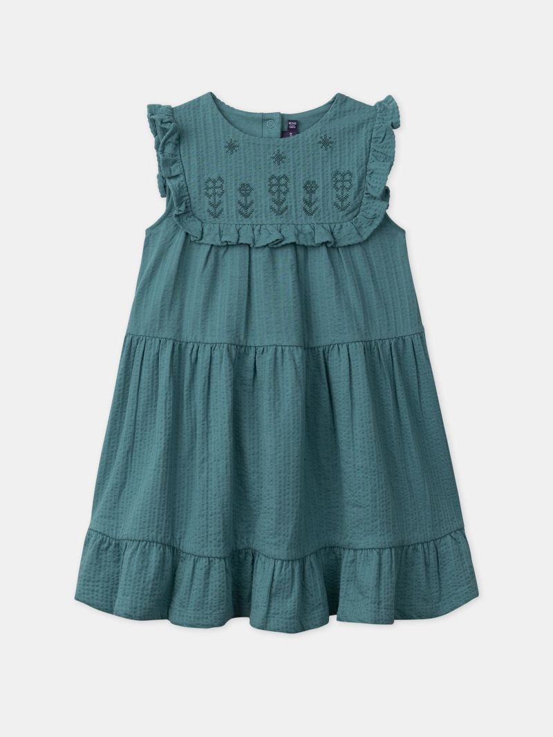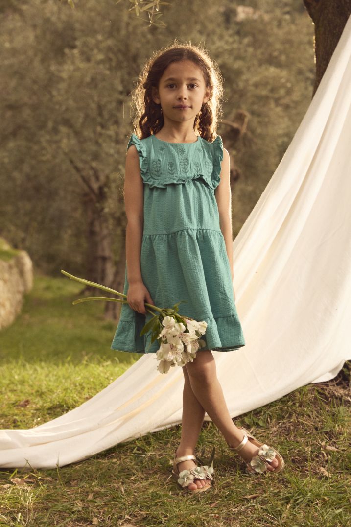 За малки принцеси, тази рокля в зелен цвят с волани е създадена да внесе елегантност и комфорт в специалните моменти. Изработена от лека и приятна на допир текстурирана памучна материя, тя осигурява свобода на движение и комфорт през целия ден. Частичното откопчаване с копчета тик-так на гърба улеснява обличането, а фееричните волани и фината бродерия с кръстат бод придават изтънчен и очарователен финиш.