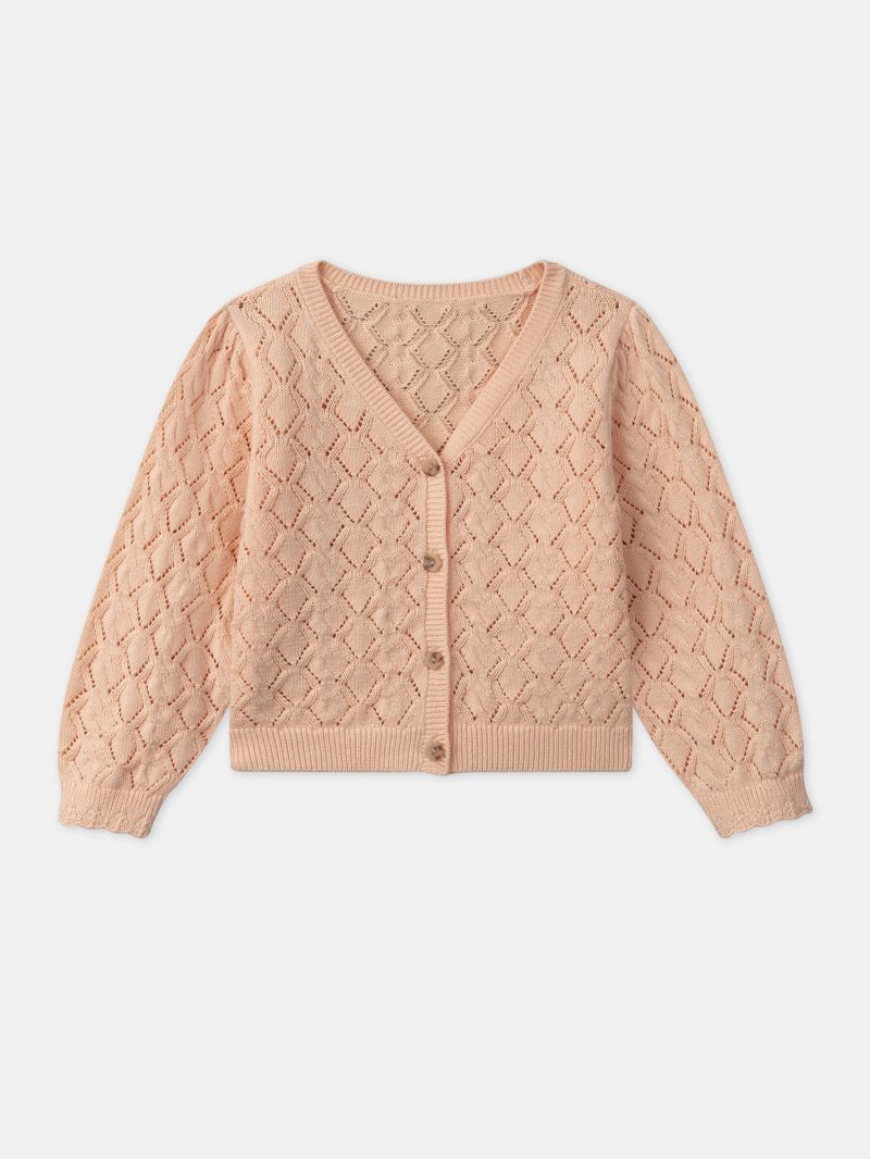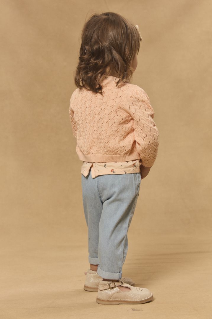 Тази ажурна плетена жилетка с V-образно деколте е класическо и практично допълнение към детския гардероб. Със своя изчистен дизайн и откопчаване с копчета по дължината отпред, тя съчетава стил и удобство. Изработена от мека материя, тя осигурява топлина без да ограничава движението. Нейната мекота ще осигури комфорт и уют за малкото ви съкровище.