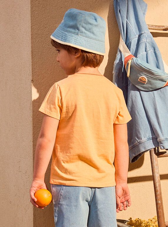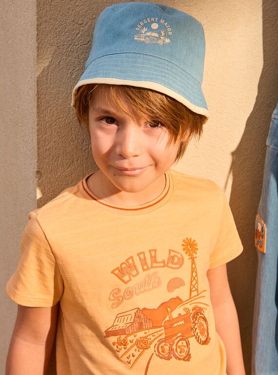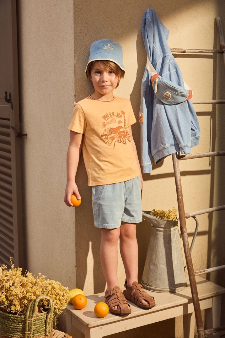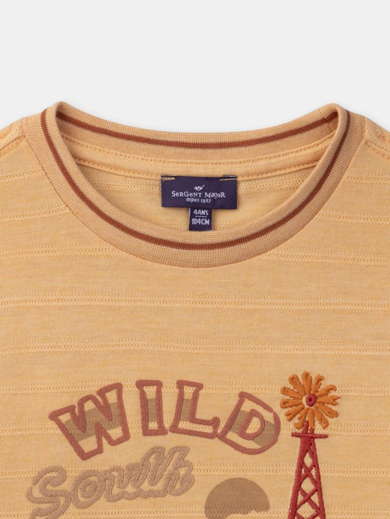 Тази тениска с мотив „Tracteur“ е чудесно предложение за малки фенове на машините и забавните принтове. Със своя цветен надпис отпред, комбиниращ релефни и бродирани елементи, моделът носи игриво и живо излъчване. Рипсеният ластик с райе на яката добавя стилен контрастен акцент, който подчертава оригиналността на визията. Удобна и свежа, тази тениска е основен елемент в гардероба на вашето момче, която ще внесе доза забавление и характер.