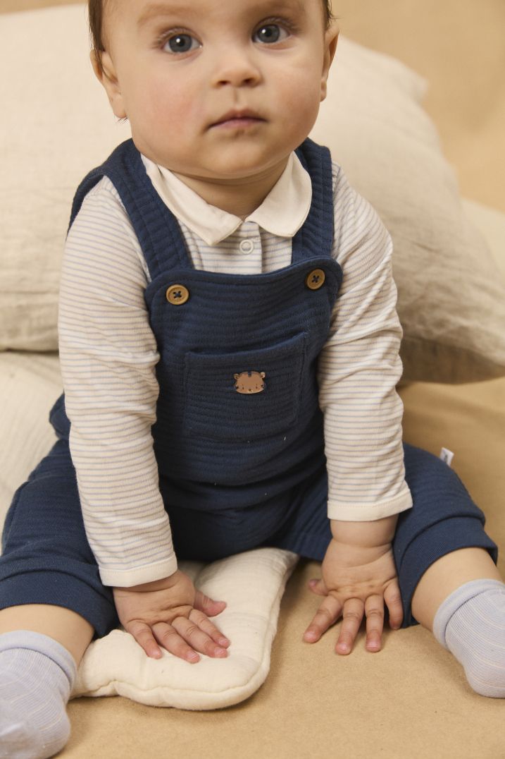 Още от първите дни на вашето новородено момченце оптималният комфорт е гарантиран! Този комплект включва мек и топъл гащеризон, който предлага нежност и топлина, съчетан с боди и топли чорапки.