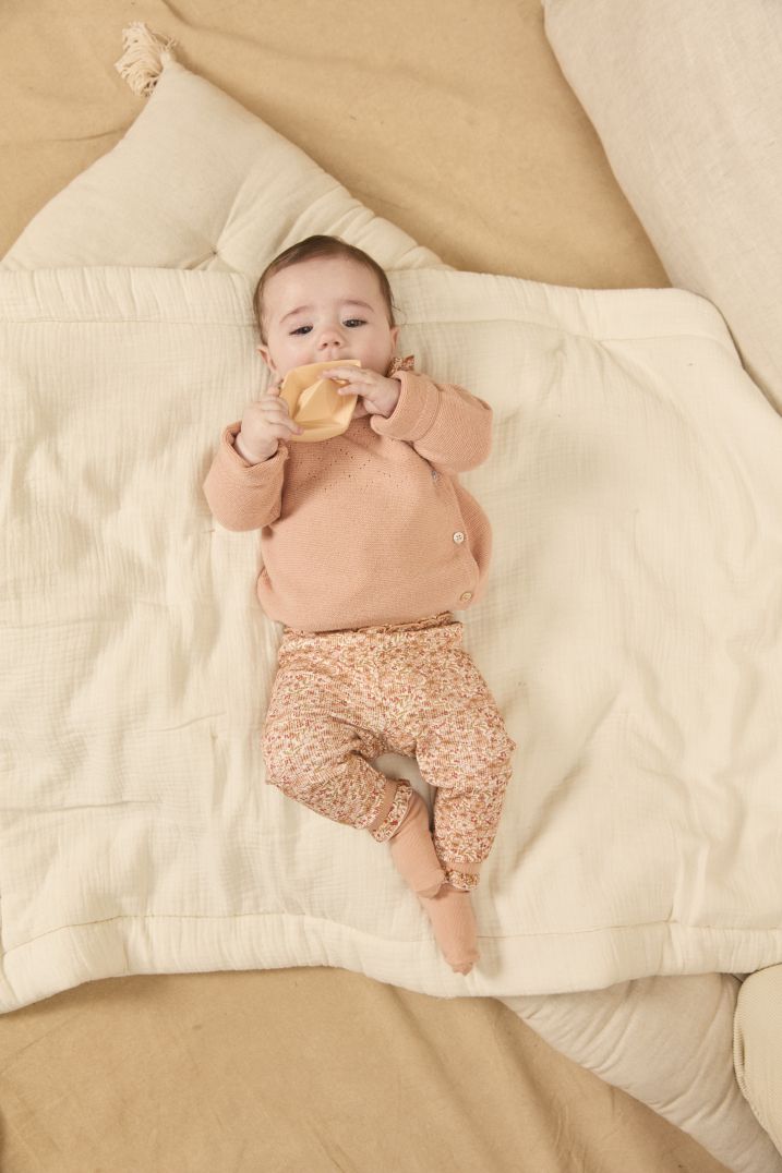 - Мека памучна материя с флорален принт в нюанси на праскова, оранжево, корал и меко кафяво на естествен фон