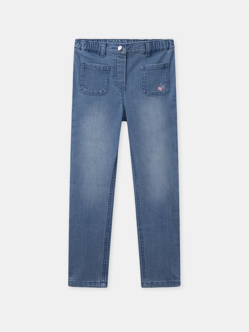 Тези стилни тесни дънки с бродерия са перфектният избор за активните малчугани. С 2 предни и 2 задни джоба с декоративни апликации, те предлагат практичност и изискан вид. Тяхната тясна кройка осигурява оптимален комфорт, като същевременно запазва модерен силует. Очарователните флорални бродерии във формата на ябълки върху джобовете придават закачлив и привлекателен акцент. Този модел е универсален вариант, който съчетава удобство и елегантност за всеки повод.