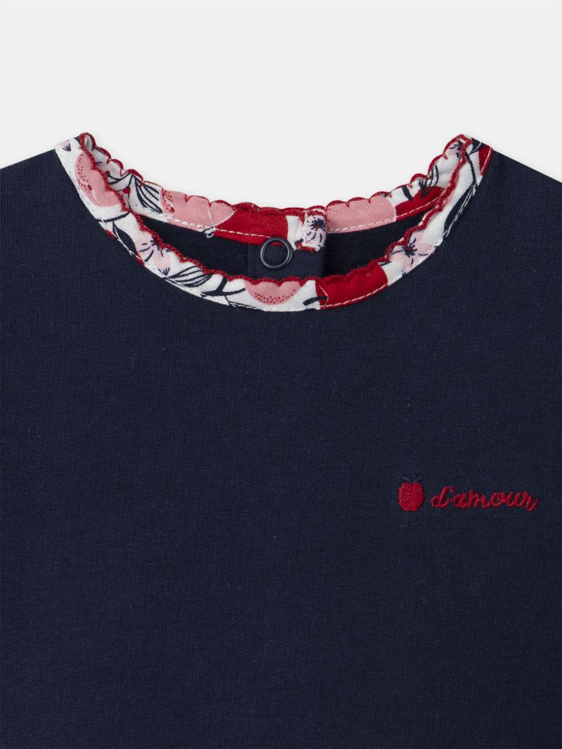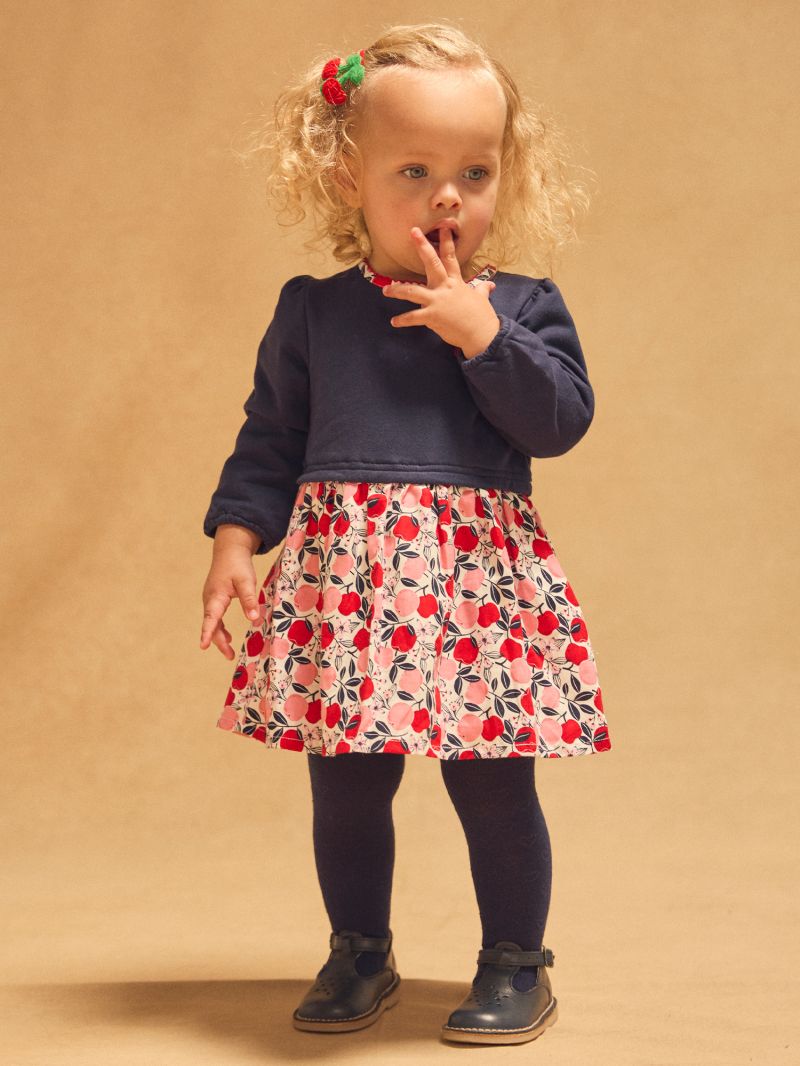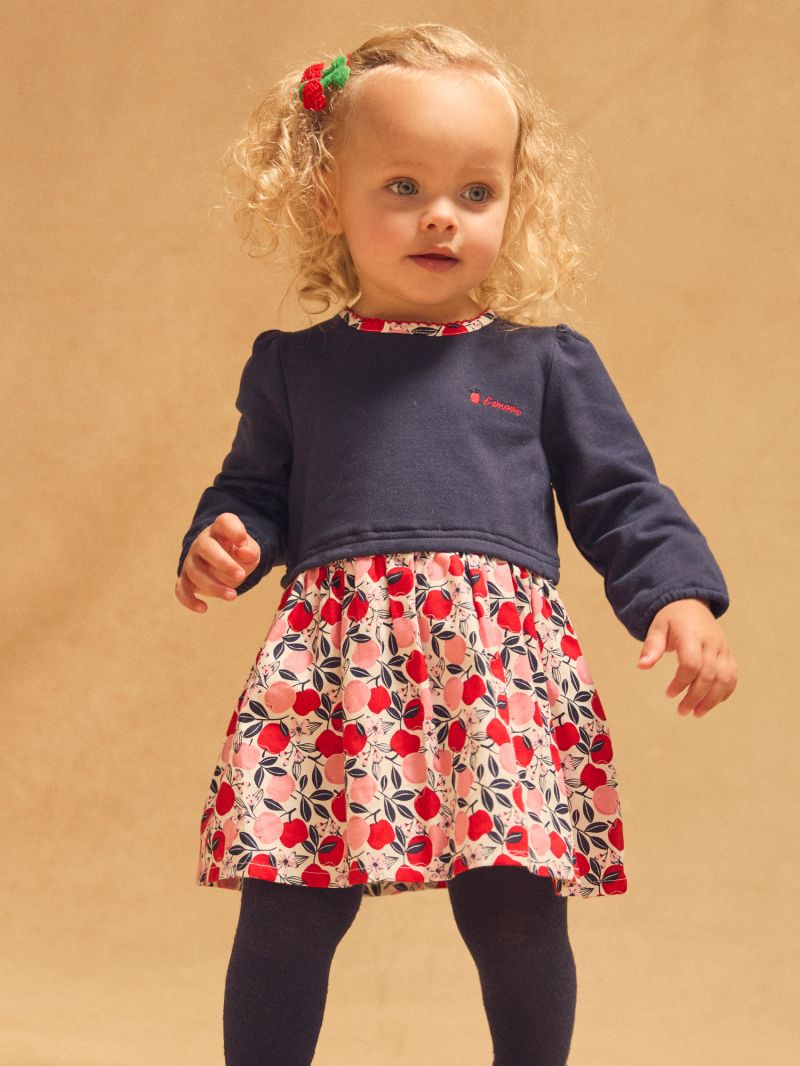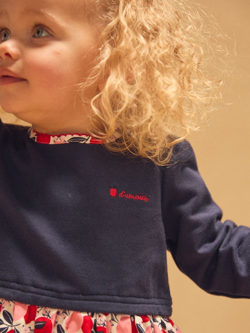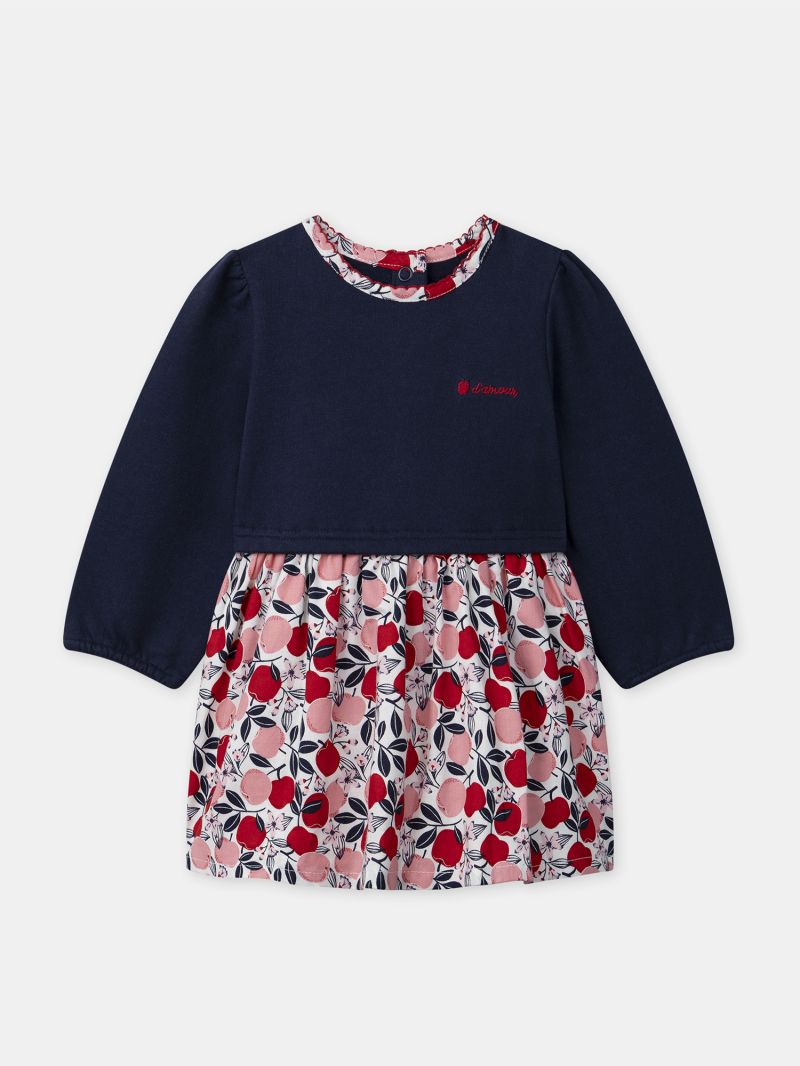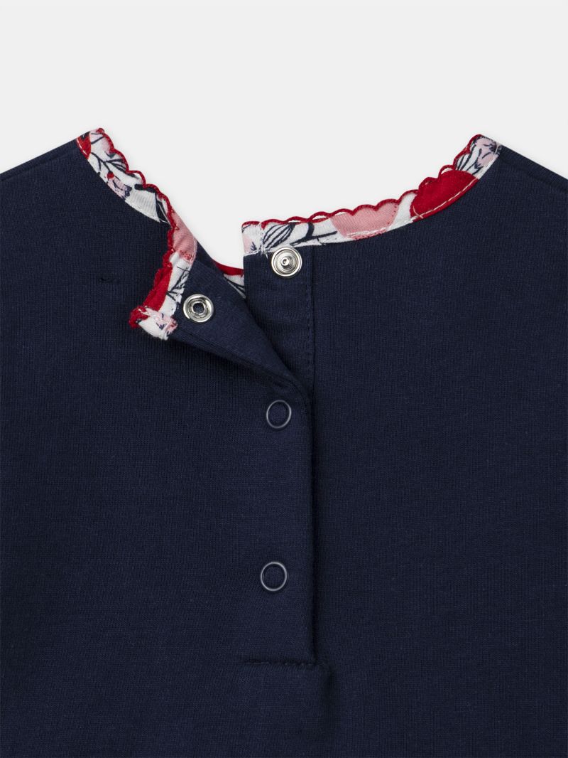 Тази очарователна рокля от две материи е перфектното съчетание на стил и комфорт. Горната част в тъмносин цвят украсена с изящна флорална бродерия, придаваща елегантен завършек. Долната част на роклята и яката са с флорален десен с тонове на червено и розов, създавайки хармонична и елегантна визия. Откопчаването с копчета на гърба осигурява удобство при обличане, което прави тази рокля подходящ избор както за специални поводи, така и за ежедневни приключения.