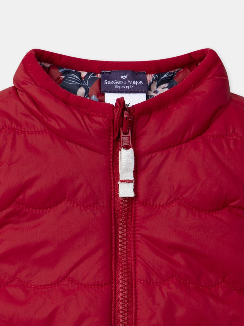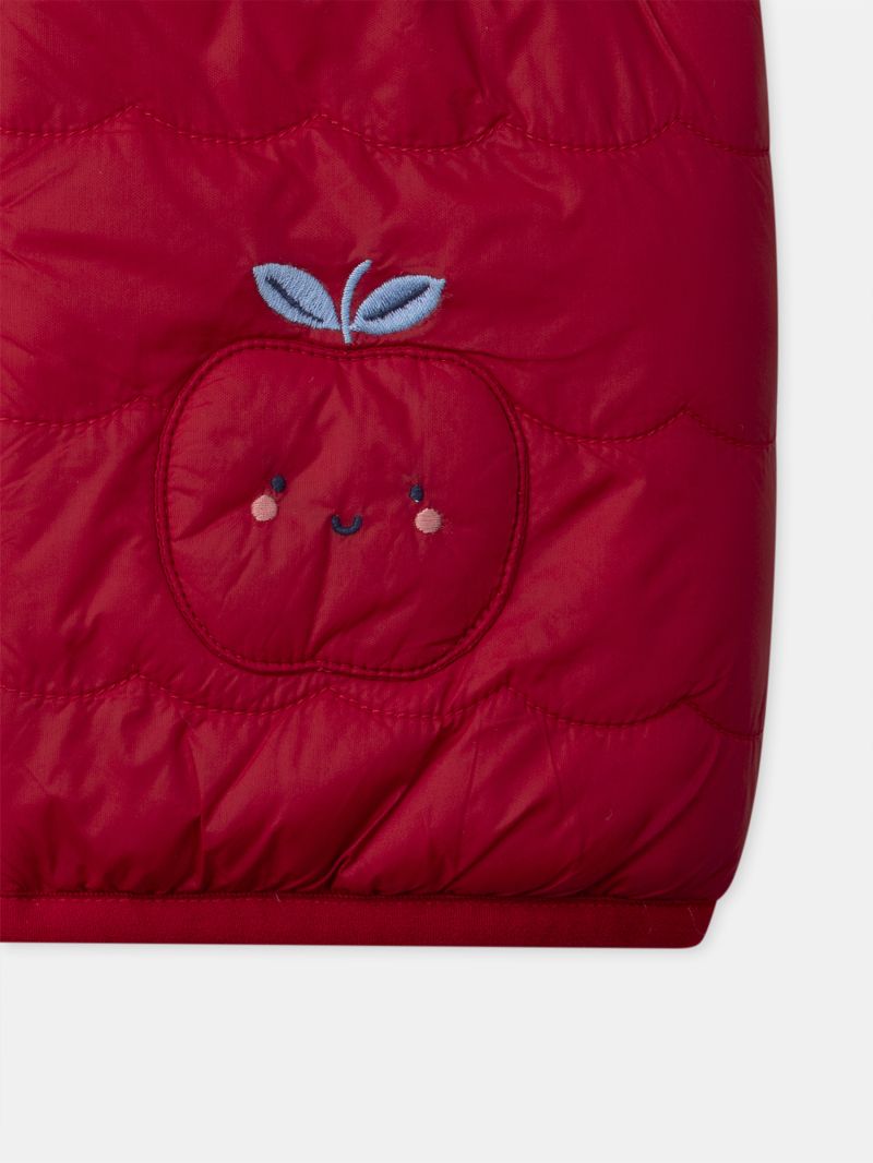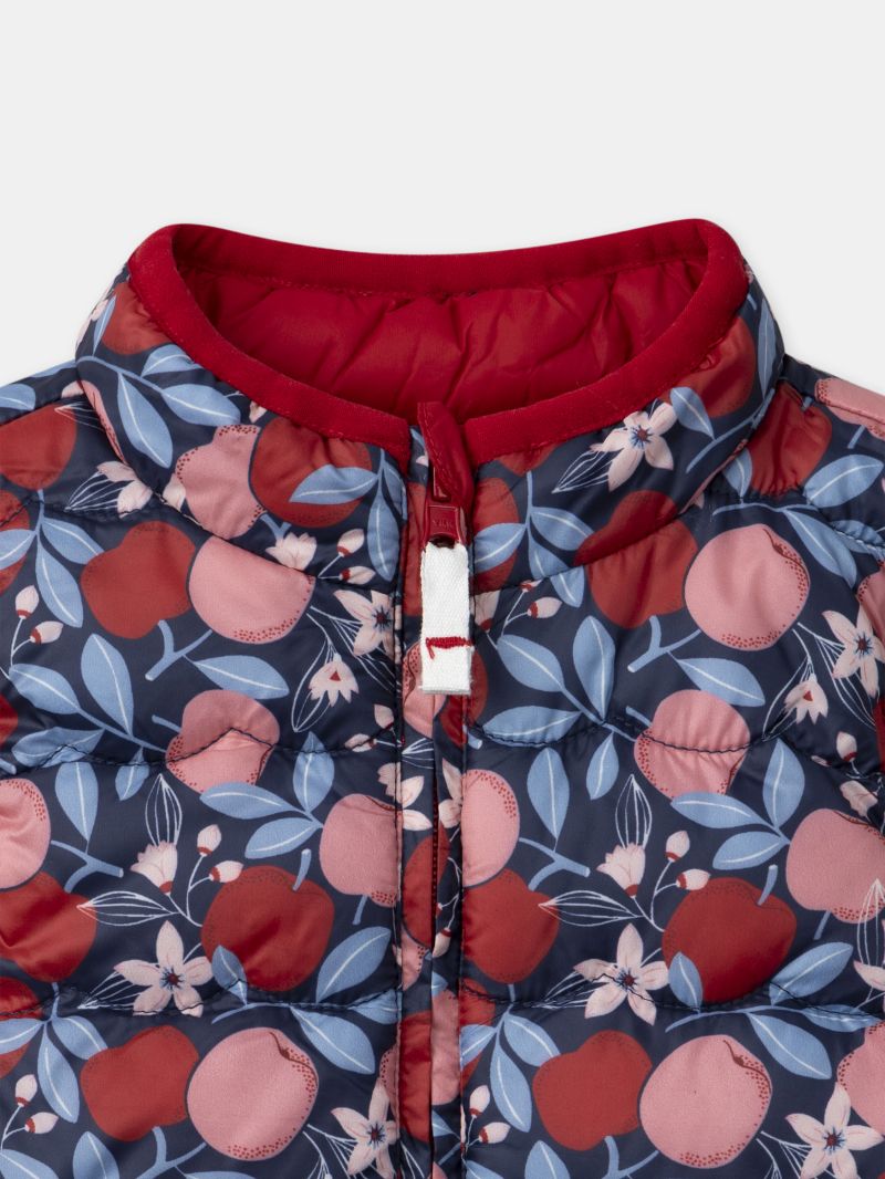 Този двулицев пухен елек е идеален за универсална и стилна визия на вашето дете. Едната страна е с капитониран червен дизайн и разполага с две бродерии на ябълки Втората страна предлага свеж десен на червени и розови ябълки върху фон в тъмносин, с контрастни червени финиши. Закопчава се с цип с предпазител за брадичката с плазгач