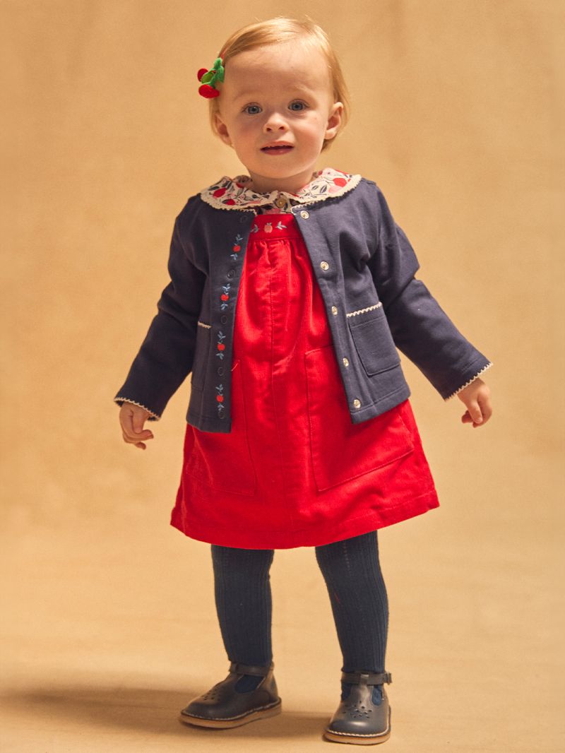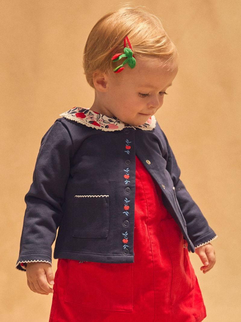 Открийте нашето леко ватирано яке-жилетка, идеално за преходния сезон. Тъмносинята жилетка осигурява оптимален комфорт и мека топлина. С два предни джоба, украсени с бели детайли и цветни бродерии с мотив на ябълки, поставени по цялата дължина отпред, добавят очарователен акцент към всяко облекло. Маншетите с флорален десен хармонично допълват дизайна, придавайки нотка деликатност и изтънченост. Откопчаването с красиви копчета тик-так по дължината отпред улеснява обличането.