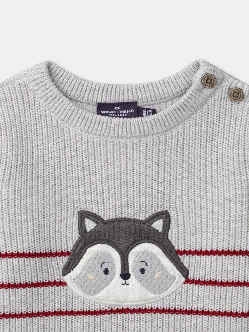Добавете нотка стил към гардероба на вашето дете с нашия светлобежов пуловер с десен на райе. Той е украсен с бродиран мотив на енот в сиво на гърдите, което придава игрив акцент на дизайна. Яката е снабдена с копчета от естествено дърво, които добавят естествен и удобен елемент. Практичен и стилен, този пуловер е подходящ за всякакви поводи.